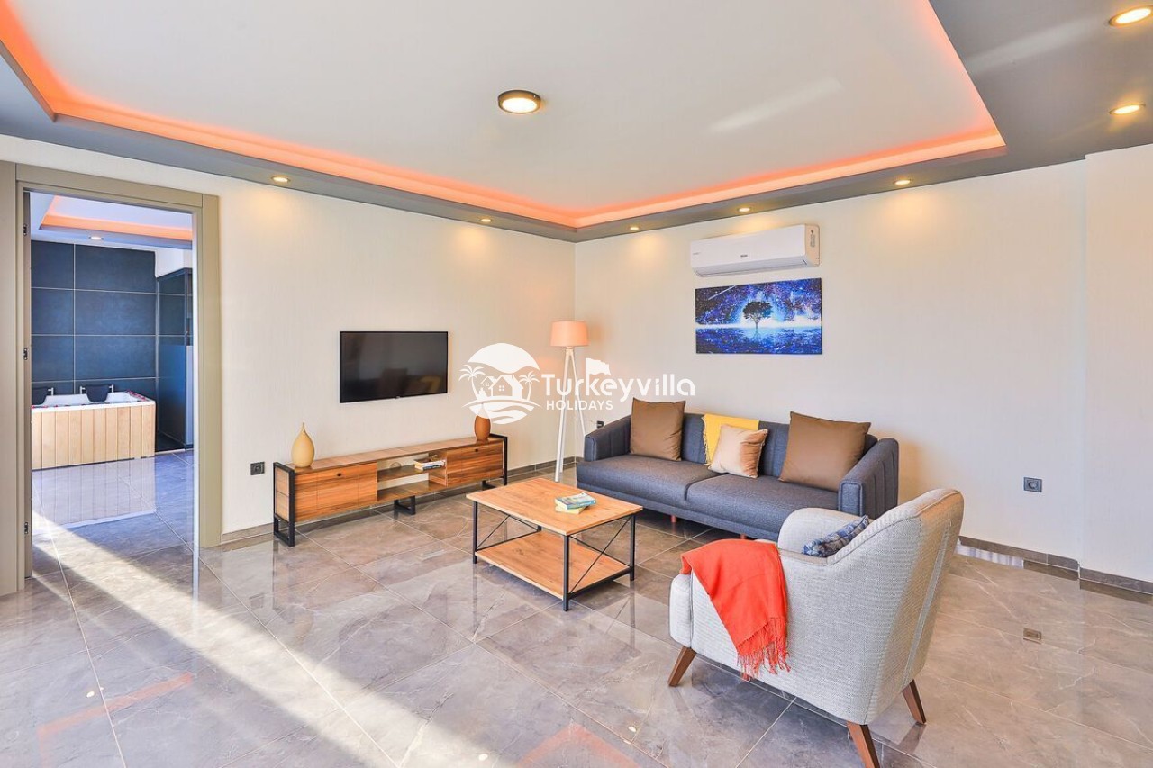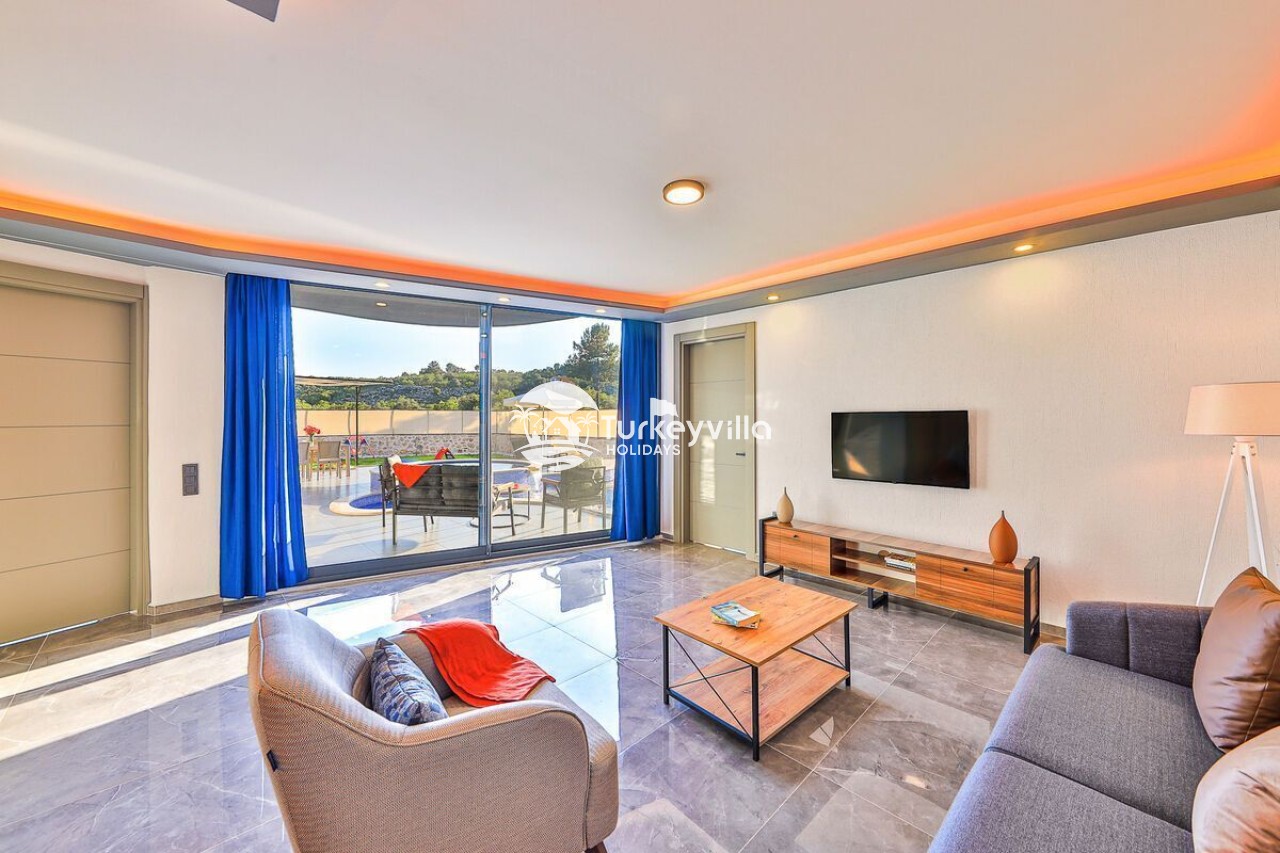 Wohnzimmer: Das für Ihren Komfort gestaltete Wohnzimmer mit Aussicht umfasst eine Sitzgruppe, einen Fernseher, eine Klimaanlage und einen Couchtisch.