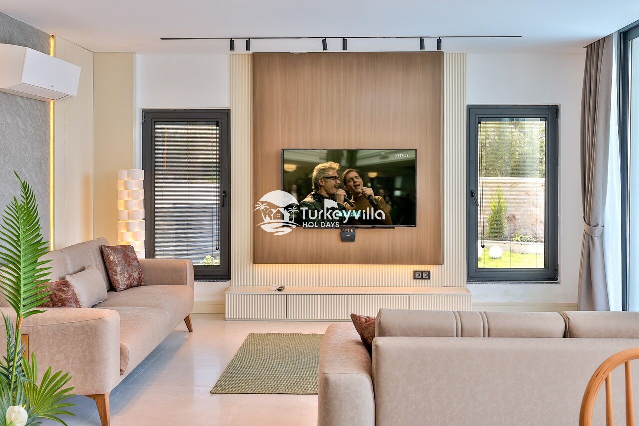 Wohnzimmer: Das Wohnzimmer ist modern und luxuriös eingerichtet und umfasst eine bequeme Sitzgruppe, einen Fernseher, eine Klimaanlage und Internet. Vom Wohnzimmer aus führt ein Durchgang zur Poolterrasse.