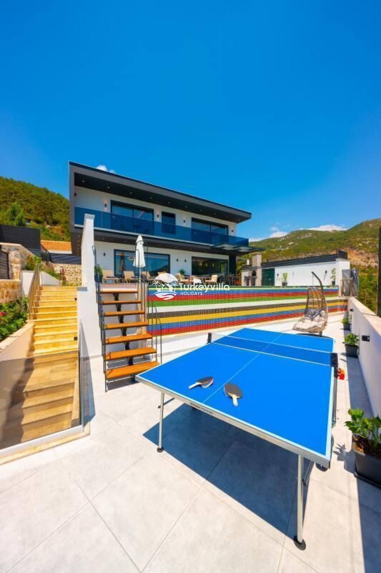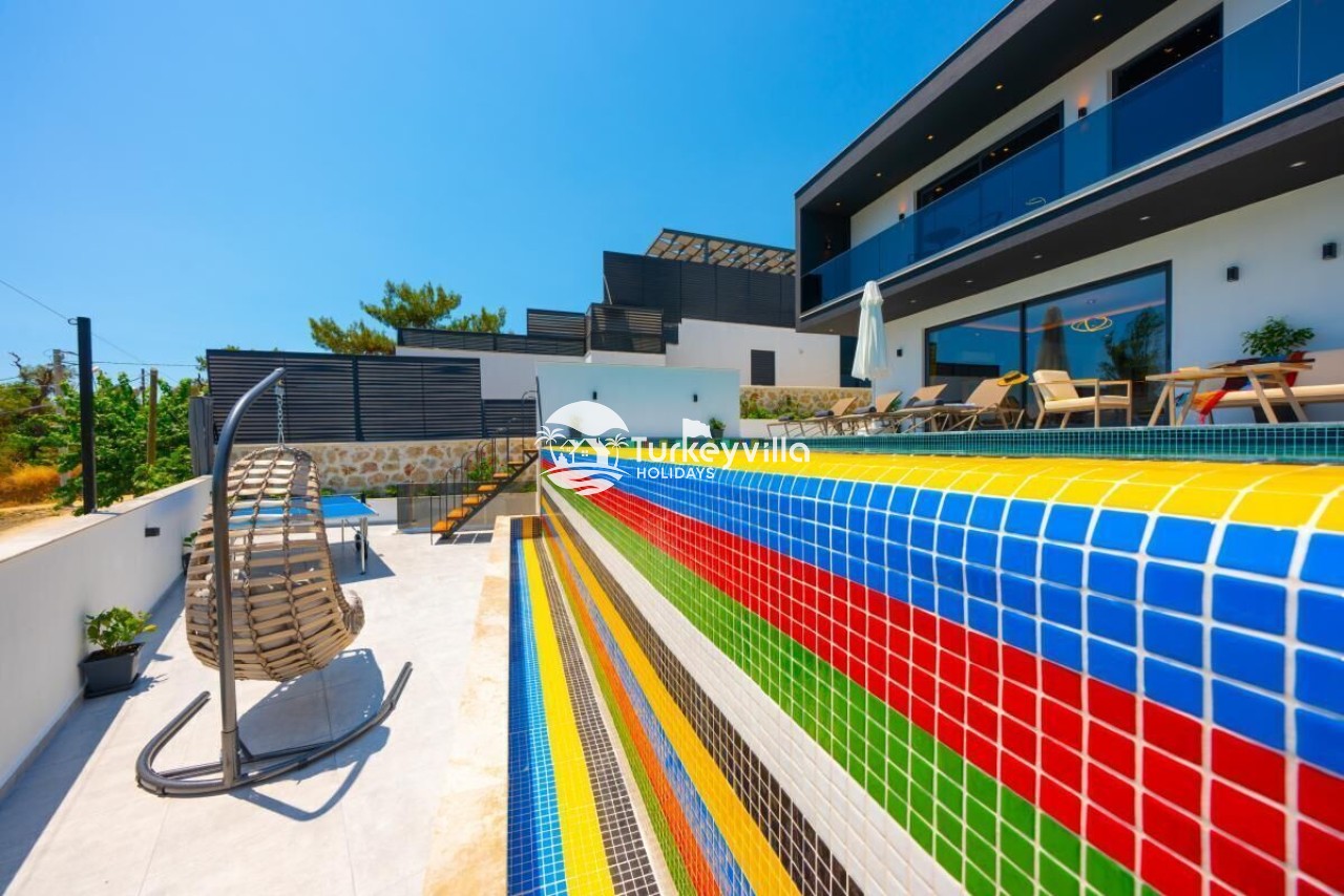 Die Villa Güney verfügt über einen großen Garten. Die Poolterrasse unserer Villa ist sehr groß und verfügt über einen Grill, Außendusche, Sonnenliegen, Sitzgruppe, Esstisch, Tischtennis, Tischfußball, Einzelschaukel, Sonnenschirm und Pergola.