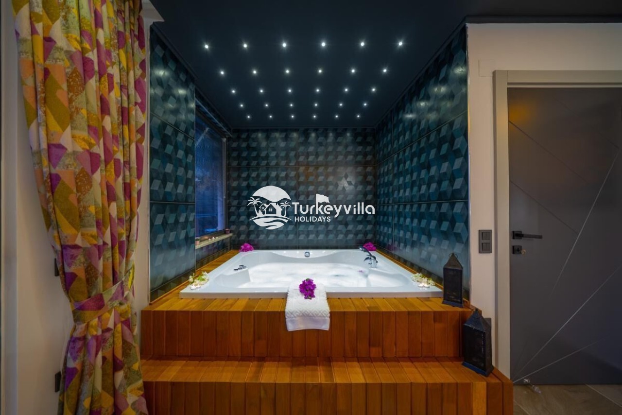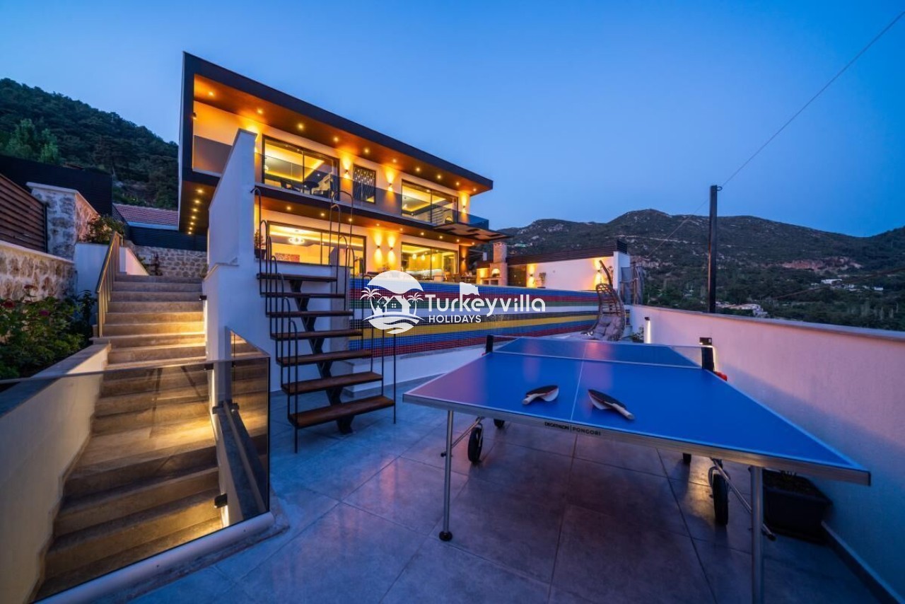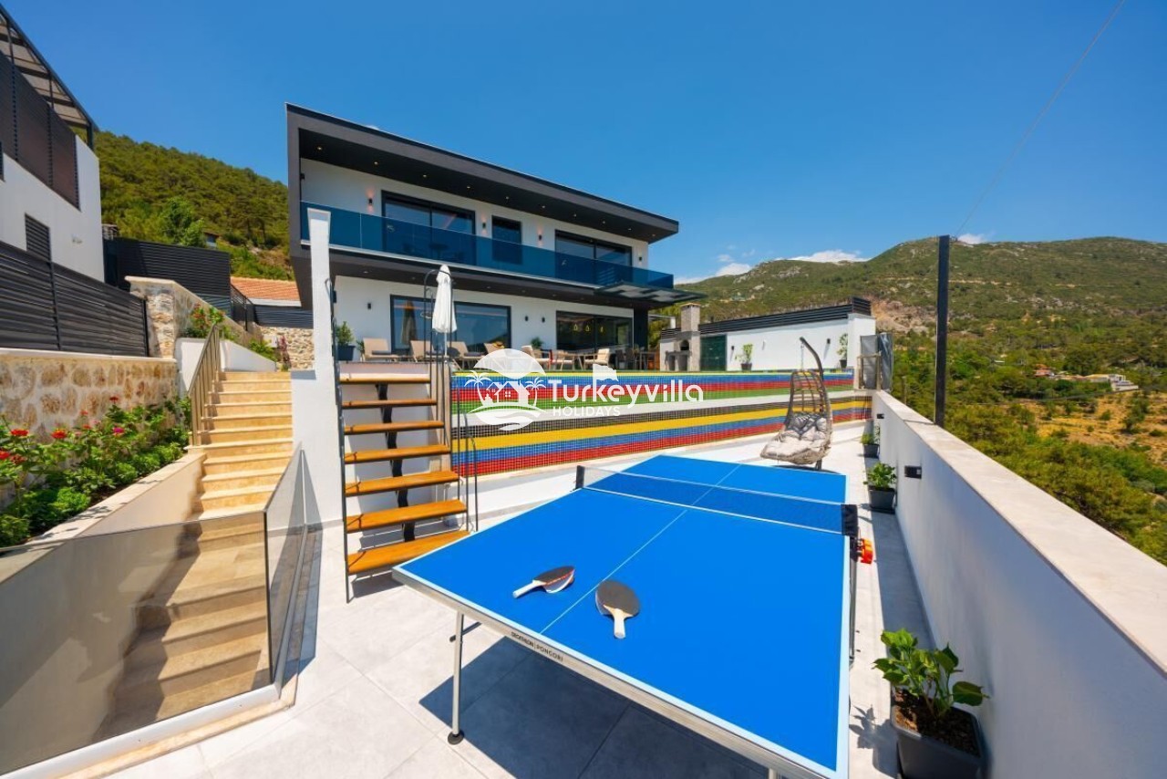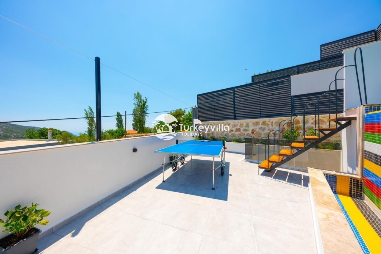 Auf der Poolterrasse können Sie sich mit Tischtennis und Tischfußball vergnügen und auf der Schaukel auf der Poolterrasse die Sommerbrise spüren. Darüber hinaus verfügt die Villa Güney über Dienstleistungen wie einen Kinoraum, einen Whirlpool im Zimmer, eine Playstation, Tischtennis, Tischfußball und einen Fernseher in jedem Zimmer, in denen Sie während Ihres Urlaubs eine angenehme Zeit verbringen können.