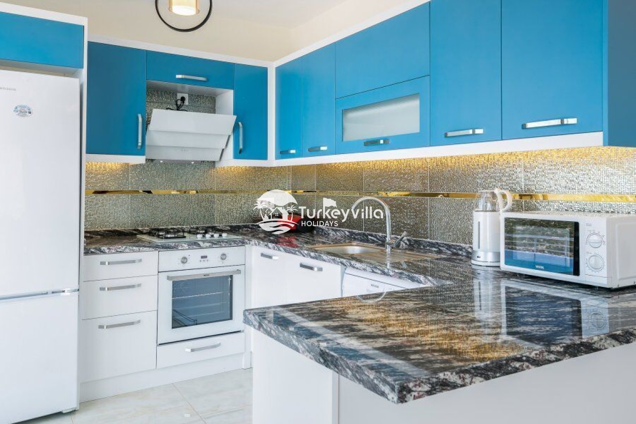 Mutfak : Amerikan mutfak içerisinde buzdolabı, bulaşık makinesi, çamaşır makinesi, ankastre 4’lü ocak, fırın, tava ve tencere takımı, elektrikli su ısıtıcısı, 8 kişilik yemek takımı, çatal bıçak takımı, su ve çay bardağı takımları yer almaktadır.