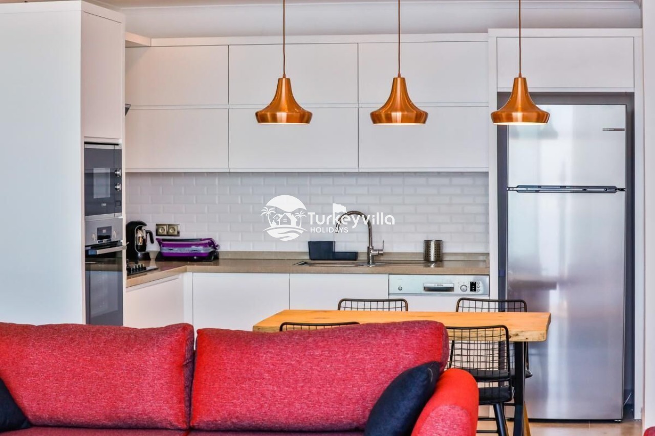 Living Room: In the living room, which is integrated with the sea and nature view, there is a seating group, satellite TV (LCD), wireless internet, air conditioning, dining table for 4 people, iron & ironing board, hair dryer, vacuum cleaner. There is an exit from the living room to the pool terrace.