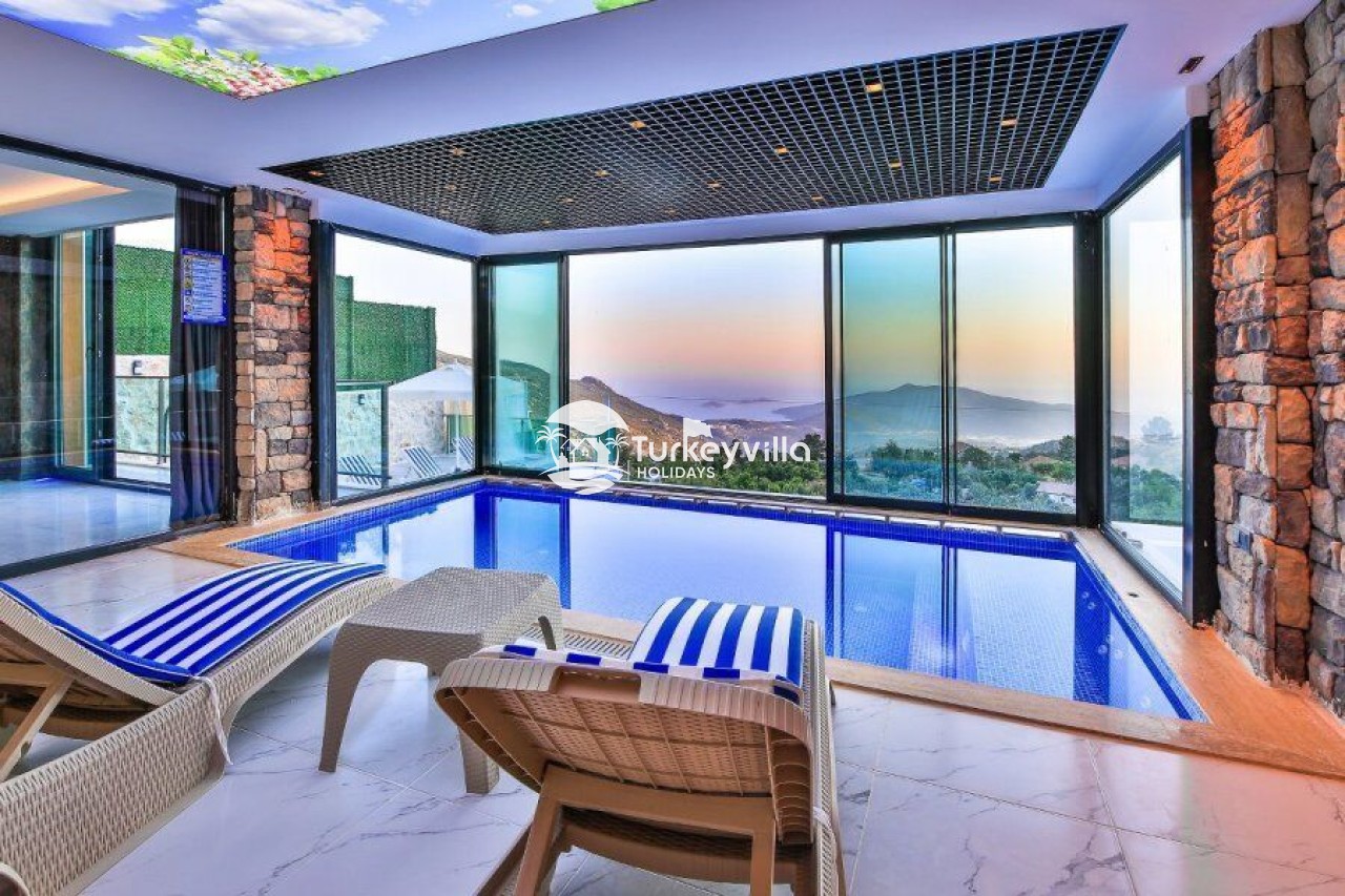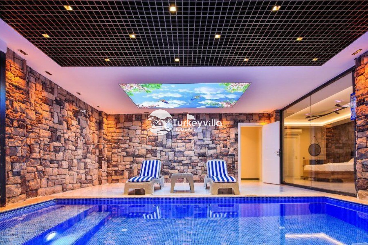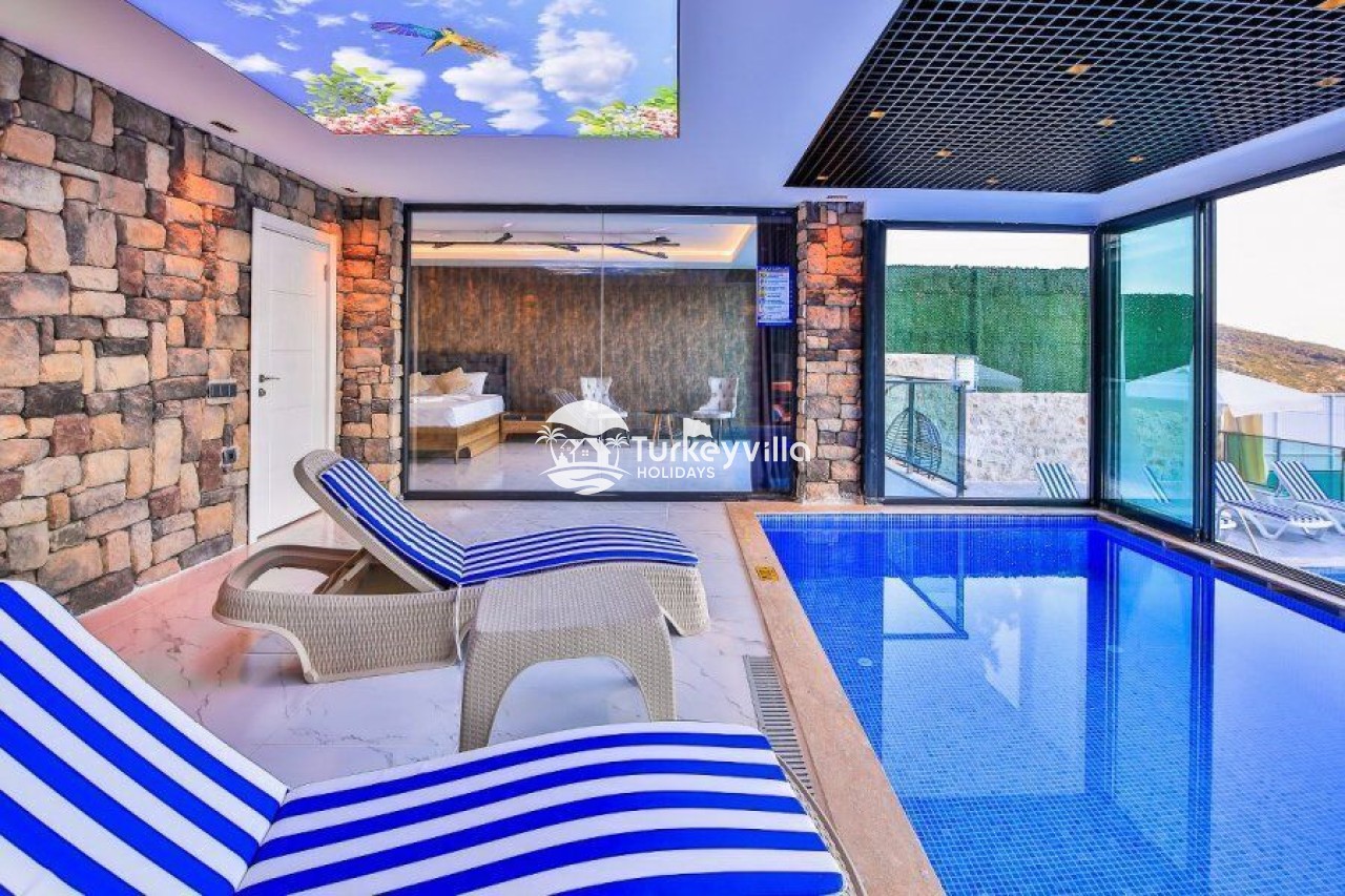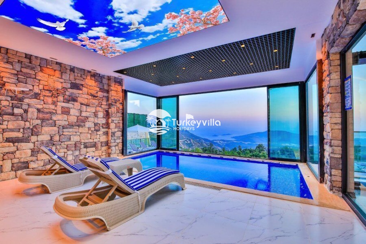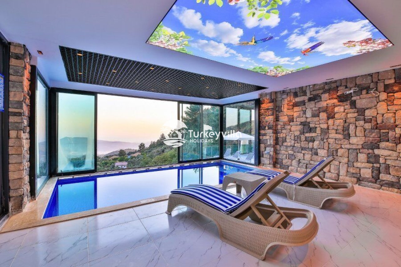 Villa Kalis 4 is a 4 bedroom luxury villa that can accommodate up to 8 people, located in the Kalkan Islamic Region. It is suitable for large families and groups of friends, and provides you with a magnificent sea and nature view. There is an indoor heated pool in the villa and a jacuzzi in one of the bedrooms. Villa Kalis 4, whose sheltered pool and garden are not visible from the outside, offers our guests an unforgettable holiday opportunity with its clean nature air and peaceful atmosphere.