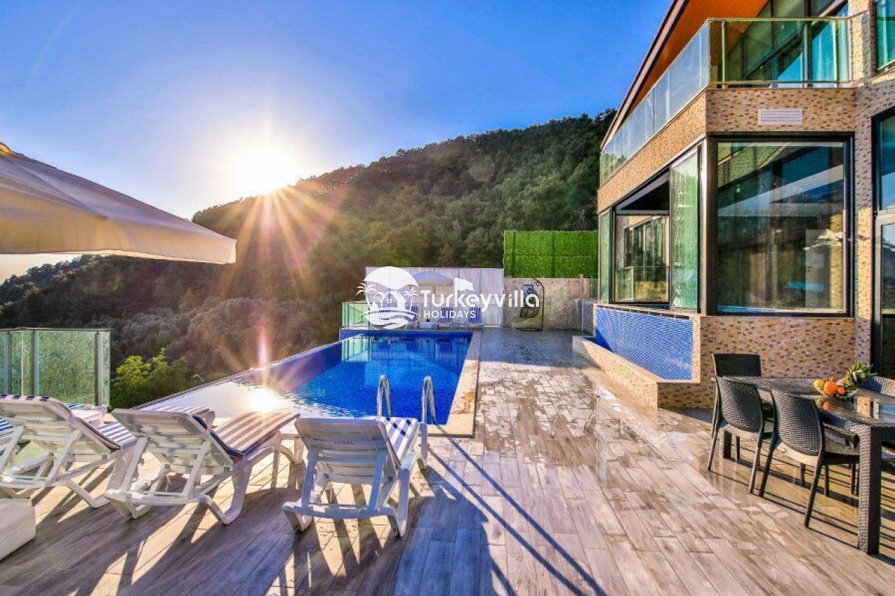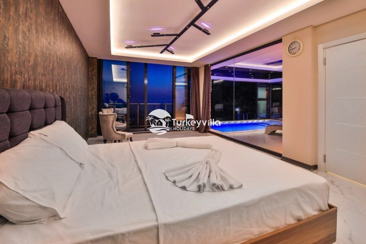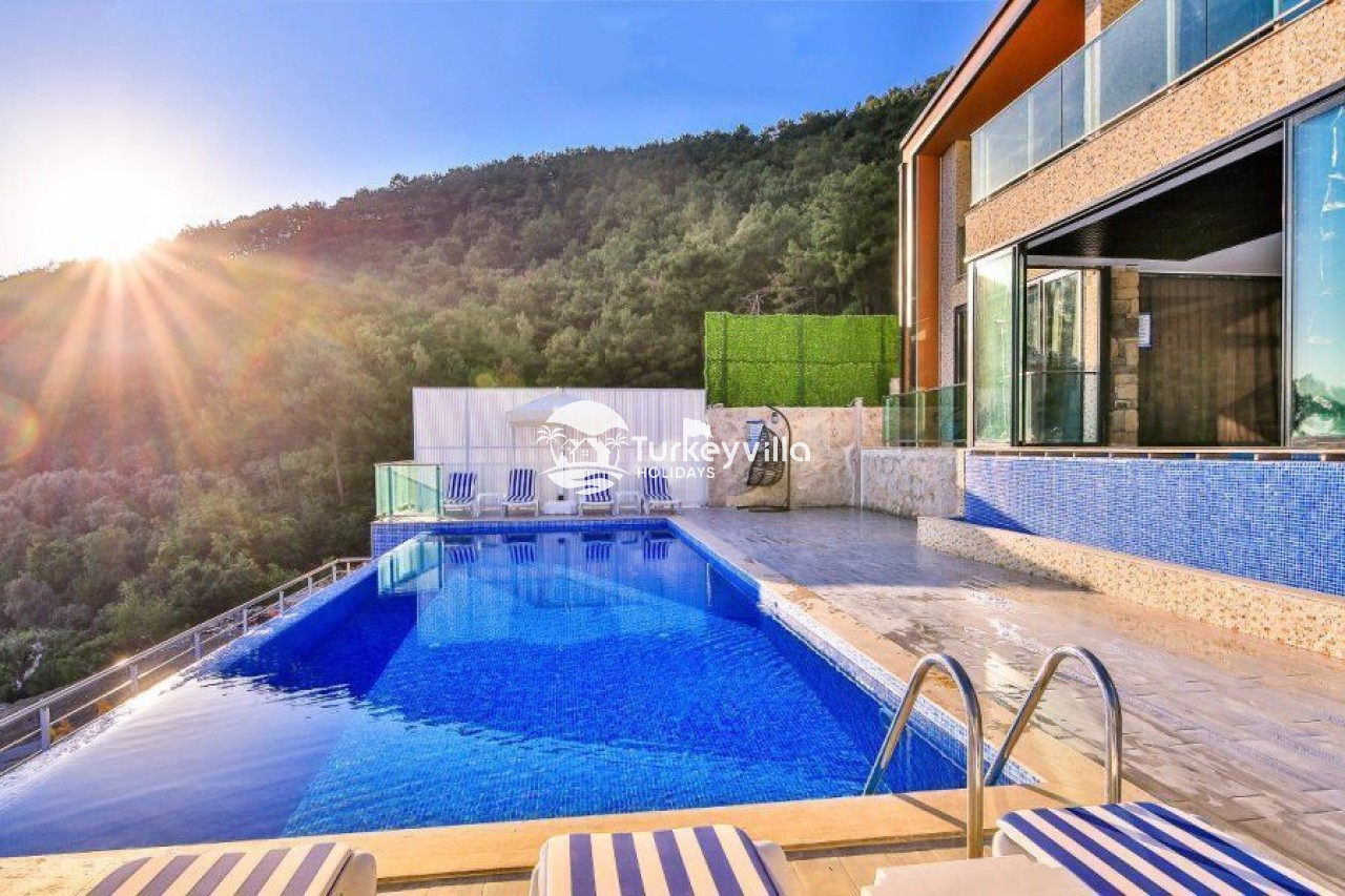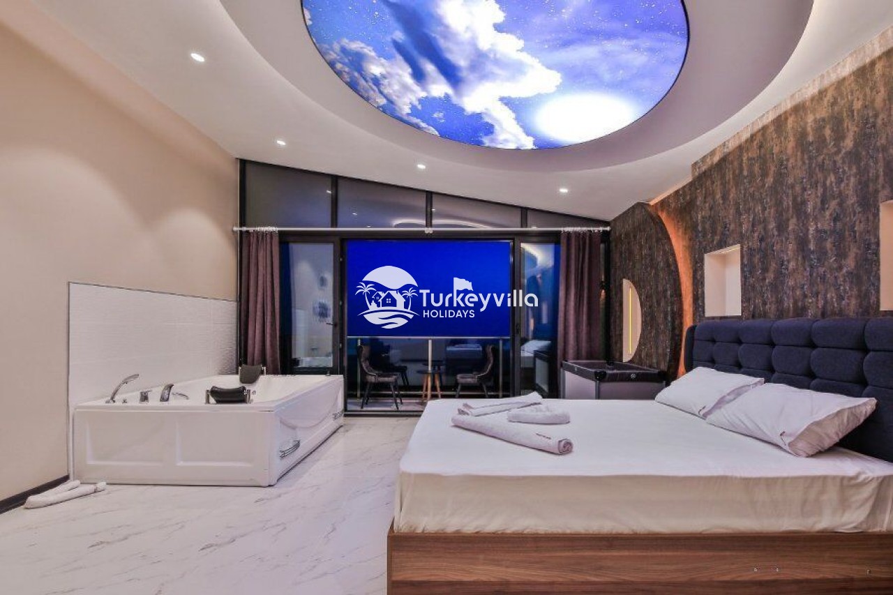 Villa Kalis 4 is a 4 bedroom luxury villa that can accommodate up to 8 people, located in the Kalkan Islamic Region. It is suitable for large families and groups of friends, and provides you with a magnificent sea and nature view. There is an indoor heated pool in the villa and a jacuzzi in one of the bedrooms. Villa Kalis 4, whose sheltered pool and garden are not visible from the outside, offers our guests an unforgettable holiday opportunity with its clean nature air and peaceful atmosphere.
