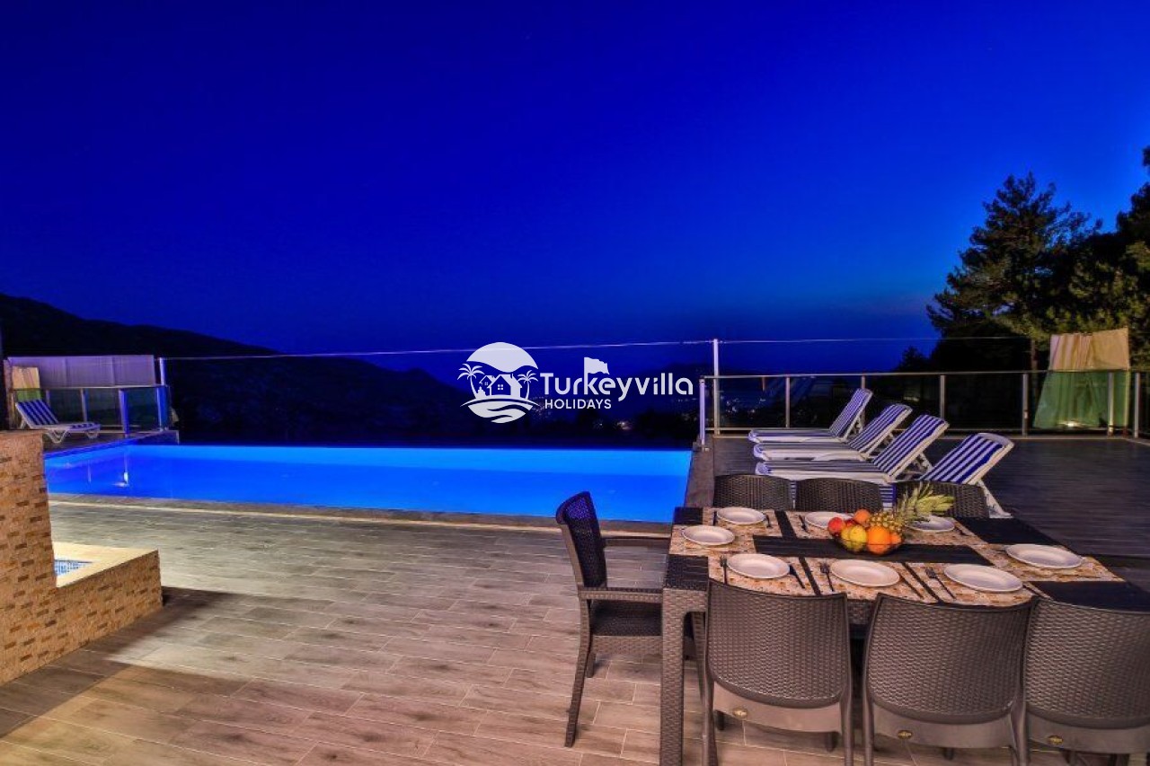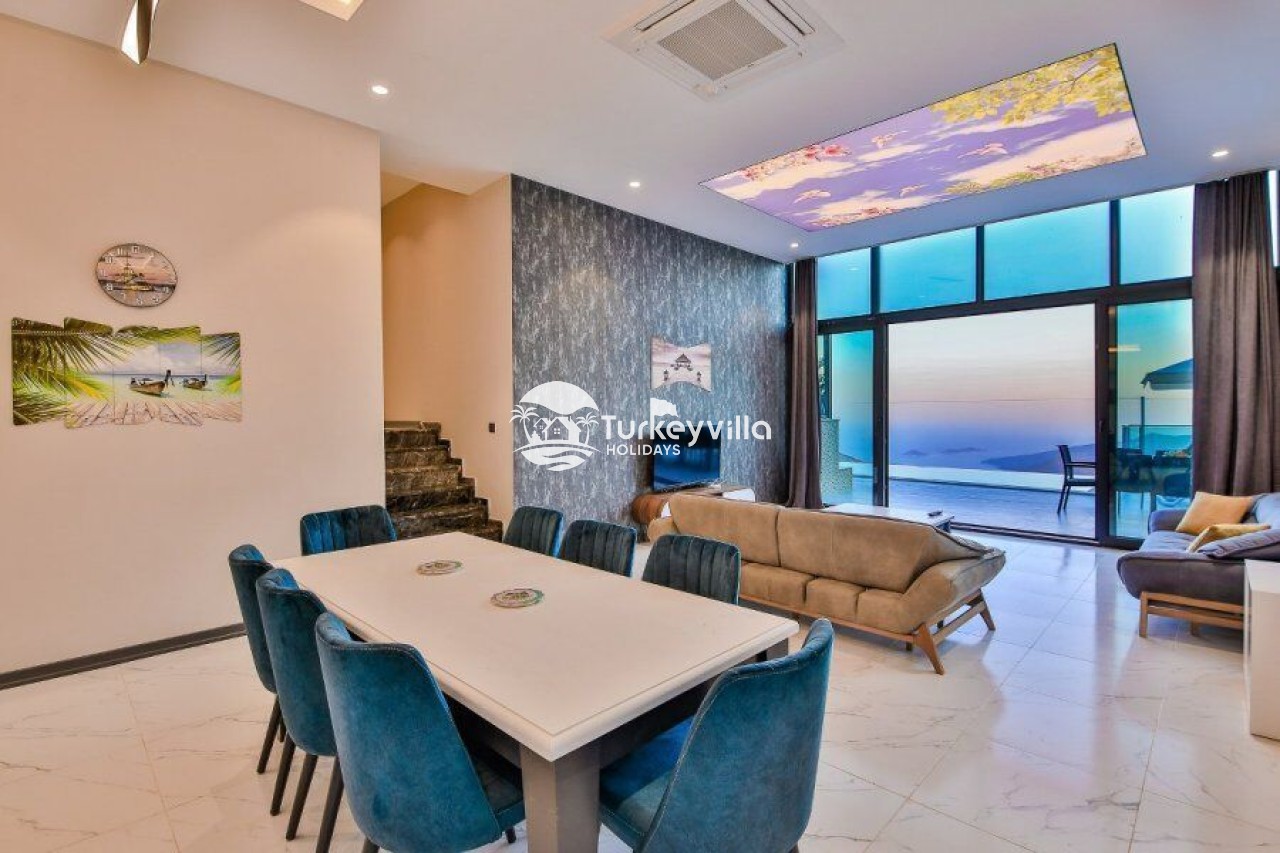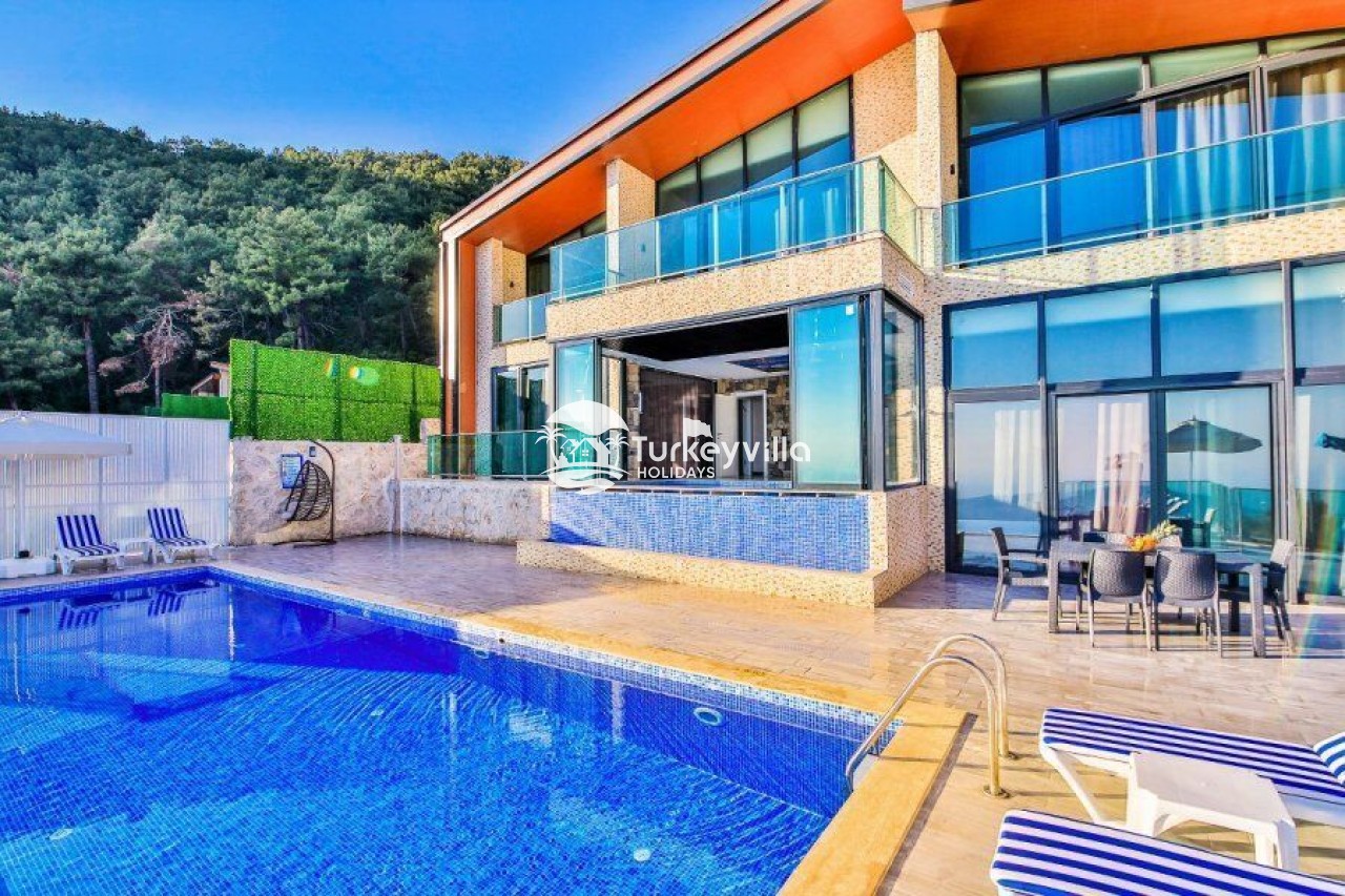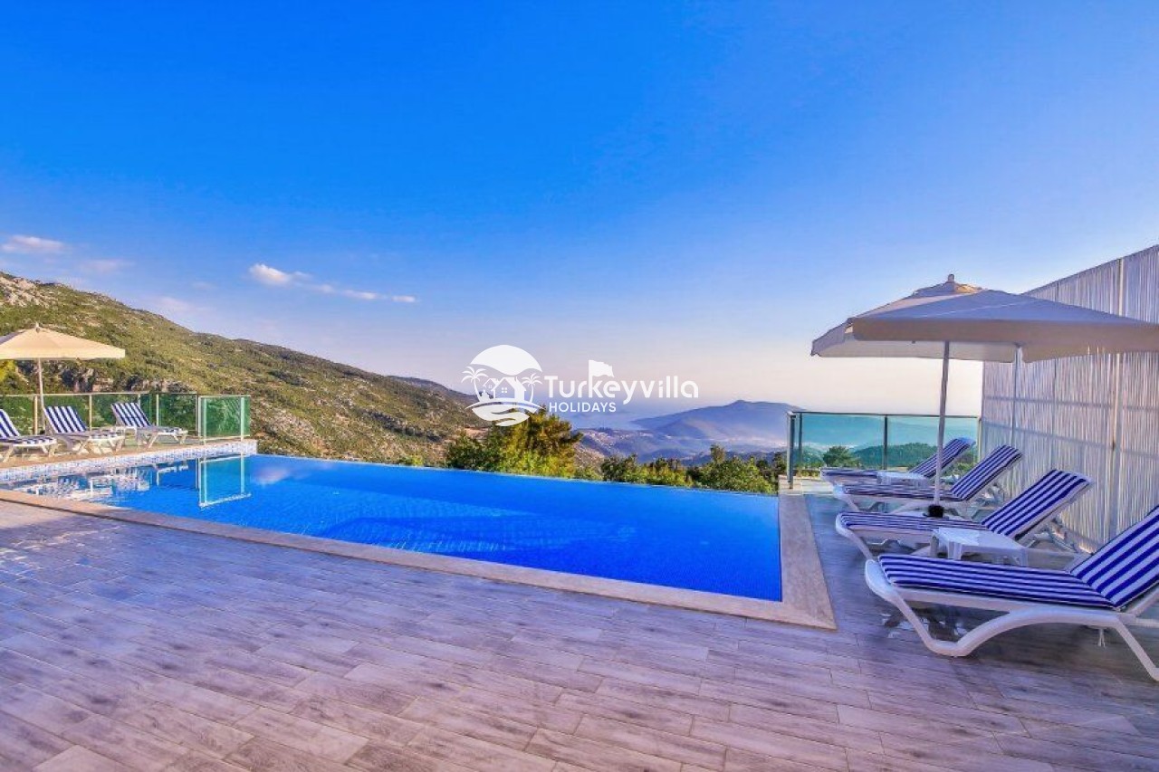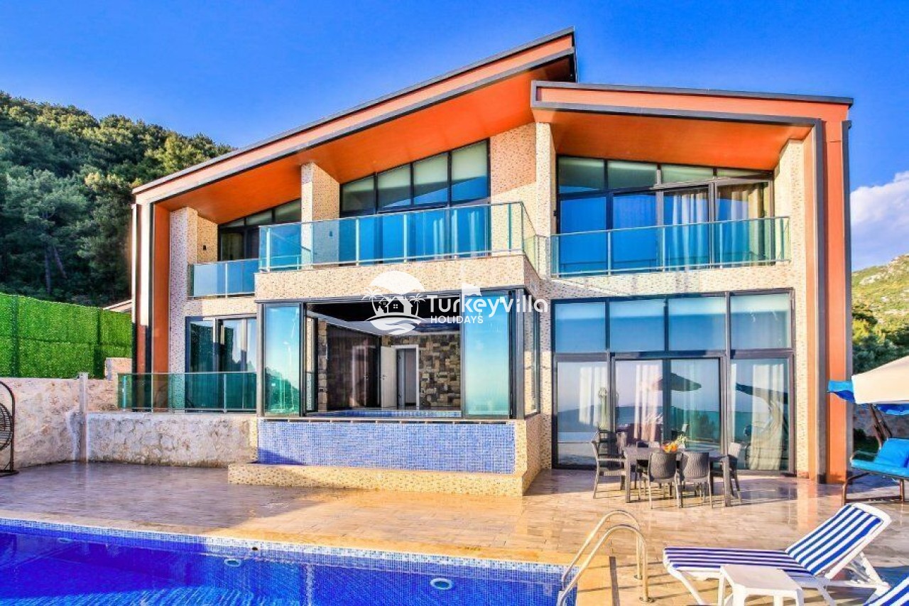 Villa Kalis 4 is a 4 bedroom luxury villa that can accommodate up to 8 people, located in the Kalkan Islamic Region. It is suitable for large families and groups of friends, and provides you with a magnificent sea and nature view. There is an indoor heated pool in the villa and a jacuzzi in one of the bedrooms. Villa Kalis 4, whose sheltered pool and garden are not visible from the outside, offers our guests an unforgettable holiday opportunity with its clean nature air and peaceful atmosphere.
