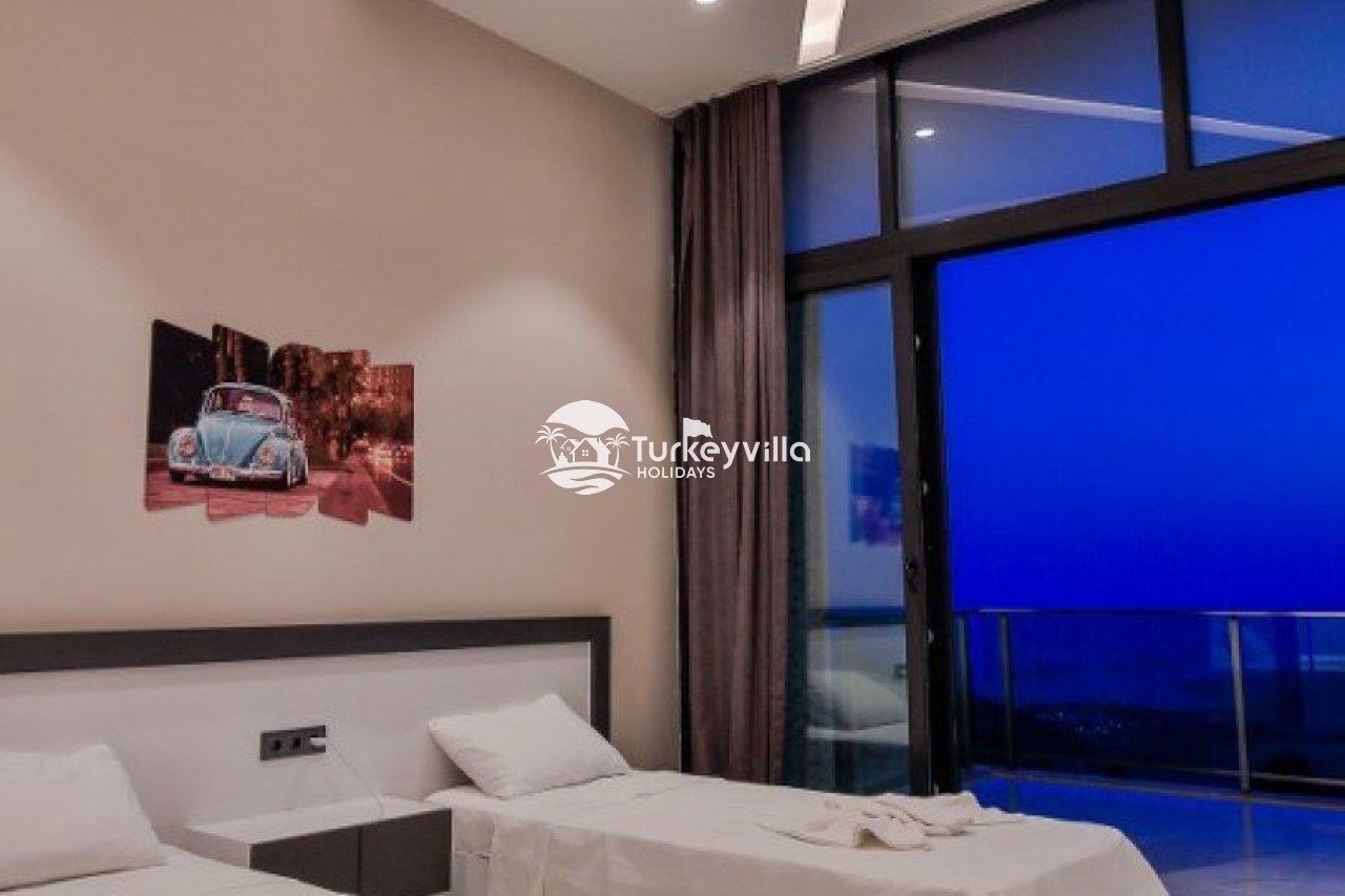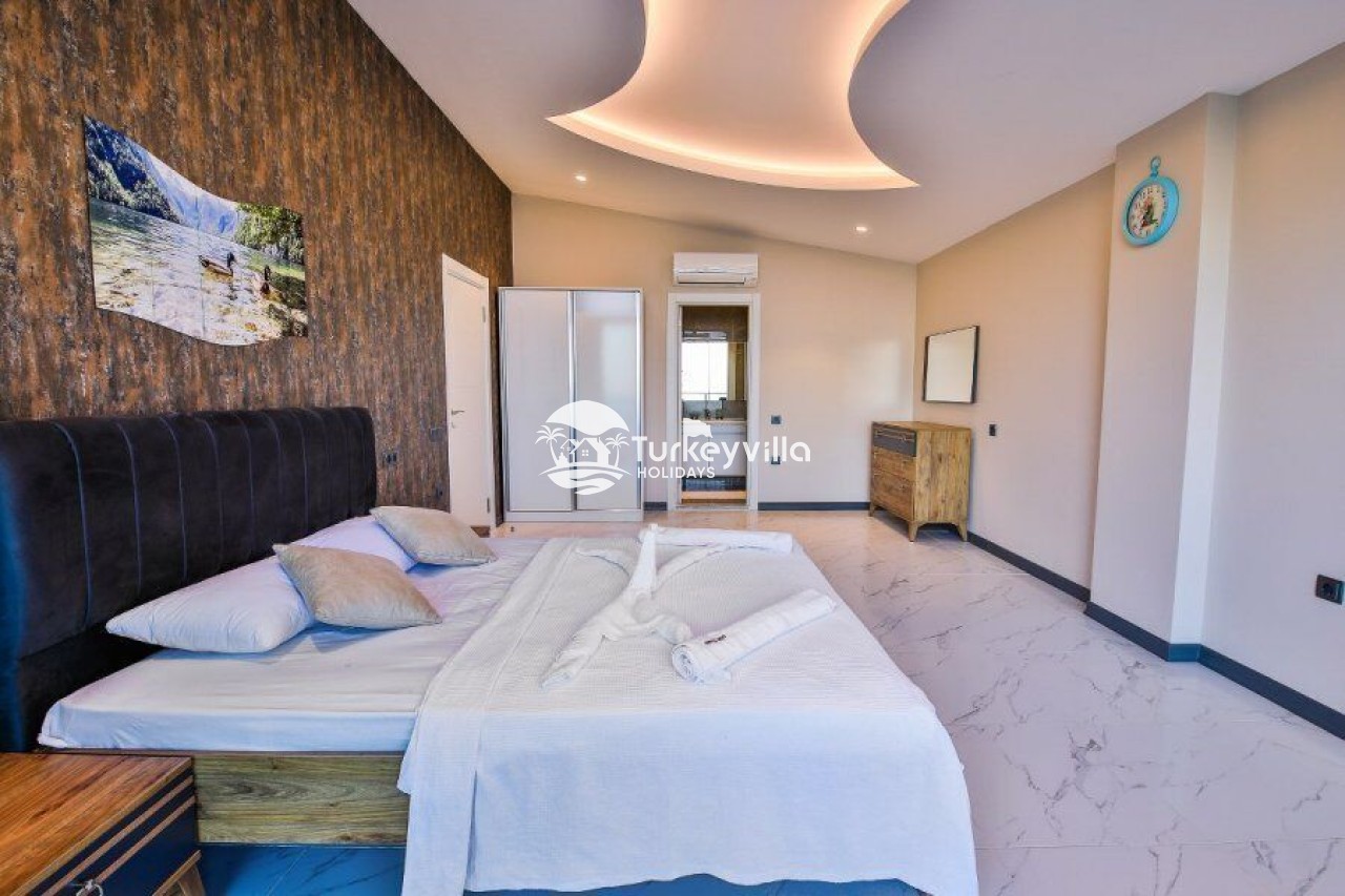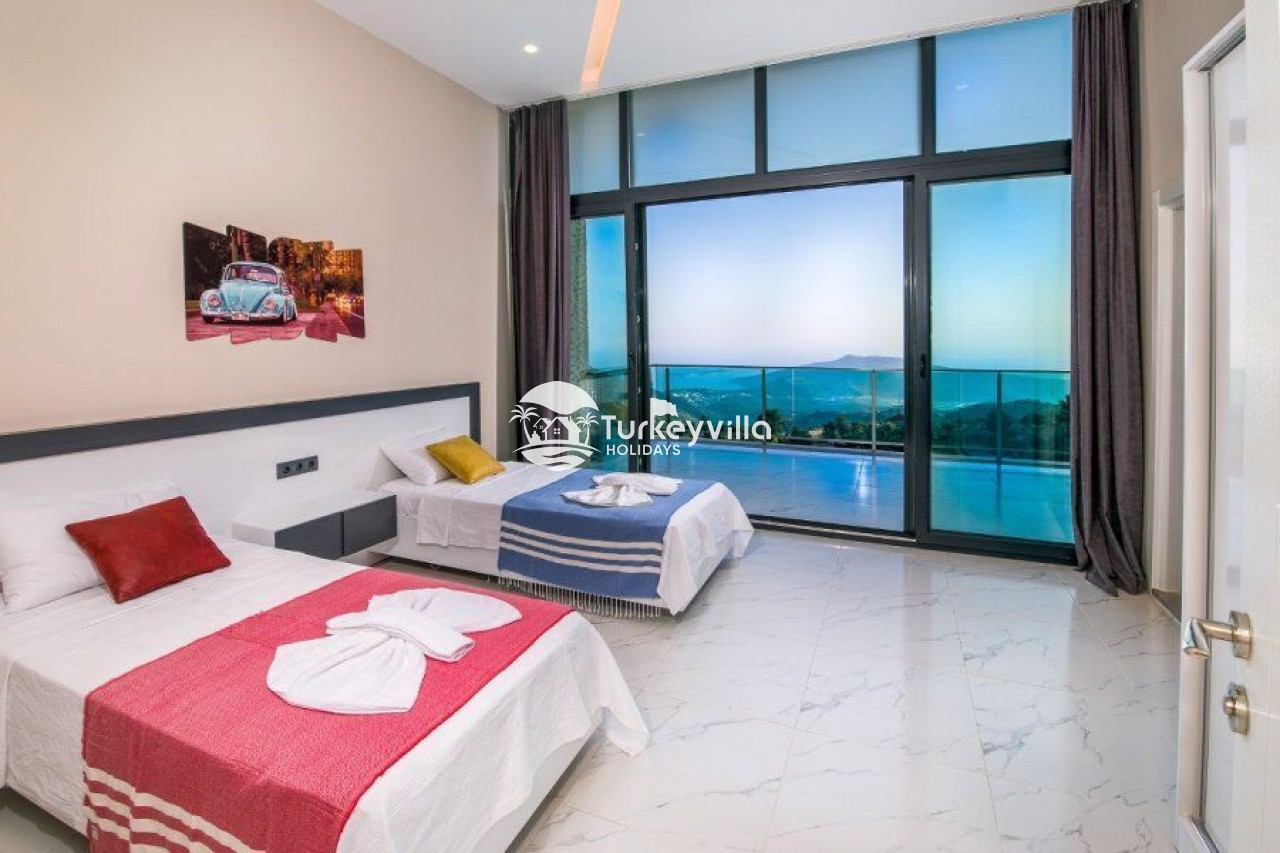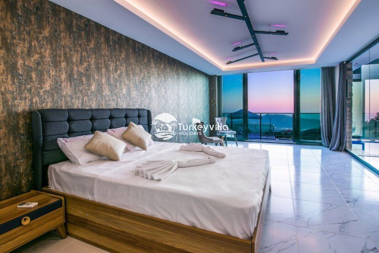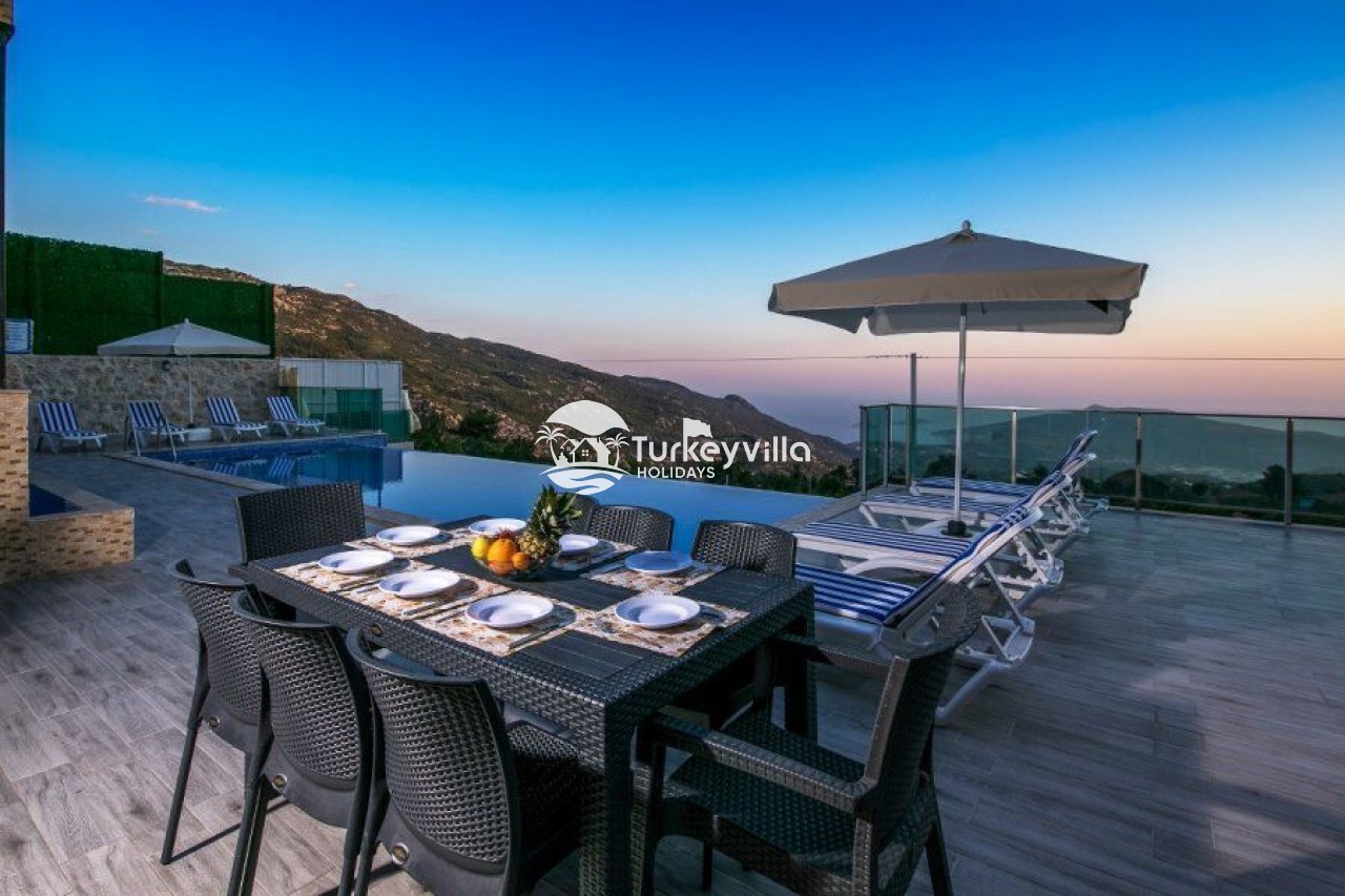 Villa Kalis 4 is a 4 bedroom luxury villa that can accommodate up to 8 people, located in the Kalkan Islamic Region. It is suitable for large families and groups of friends, and provides you with a magnificent sea and nature view. There is an indoor heated pool in the villa and a jacuzzi in one of the bedrooms. Villa Kalis 4, whose sheltered pool and garden are not visible from the outside, offers our guests an unforgettable holiday opportunity with its clean nature air and peaceful atmosphere.