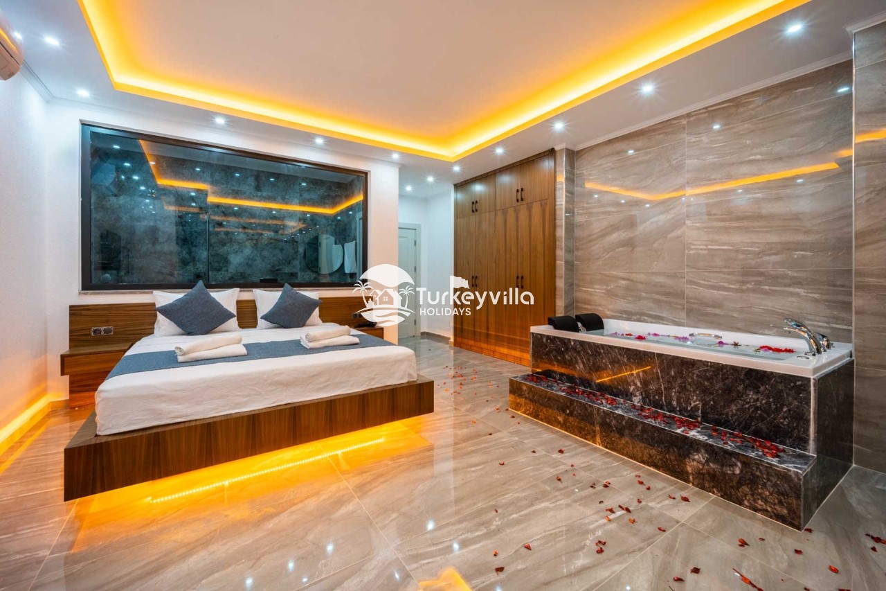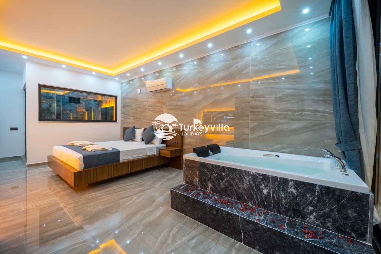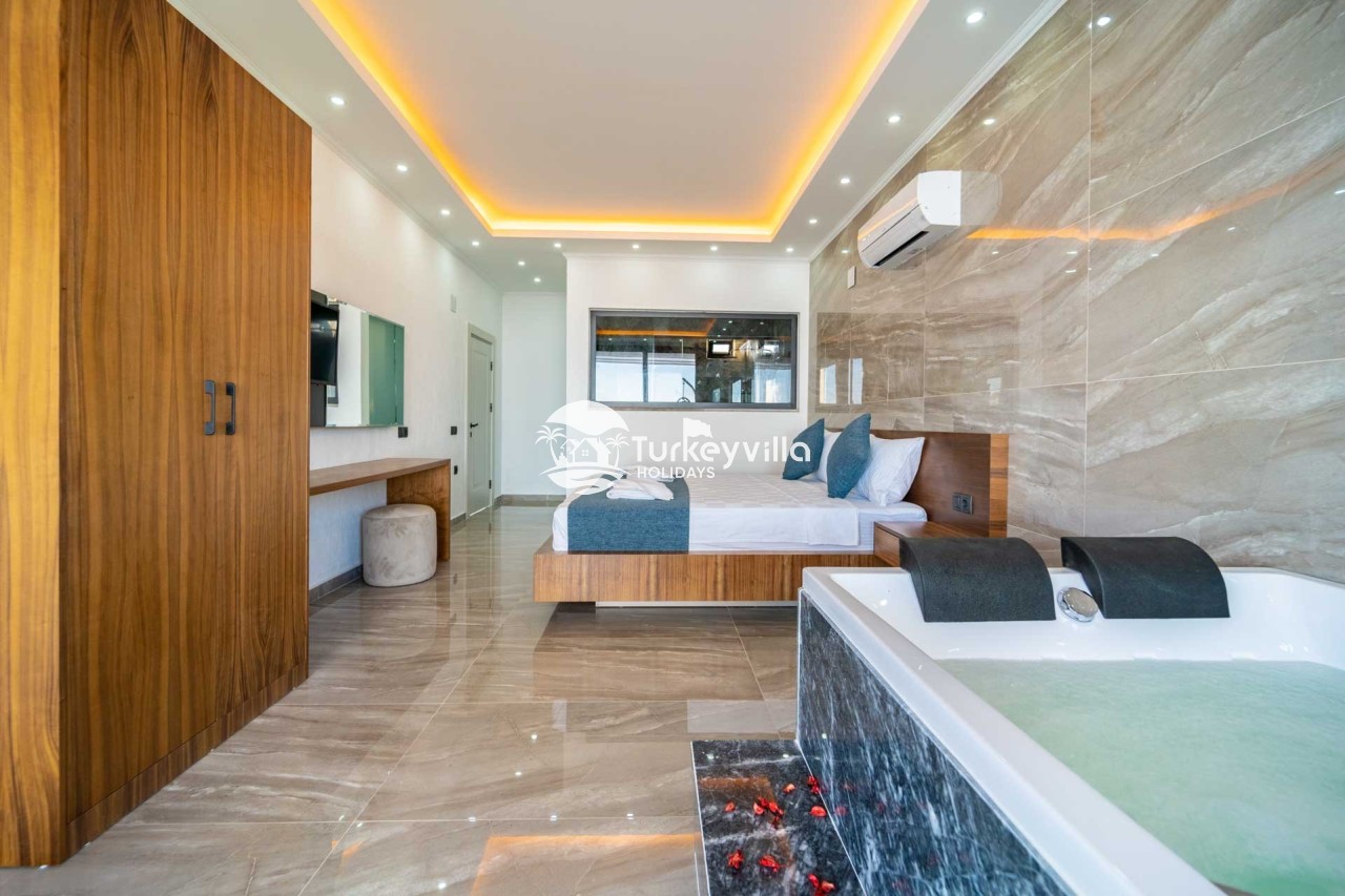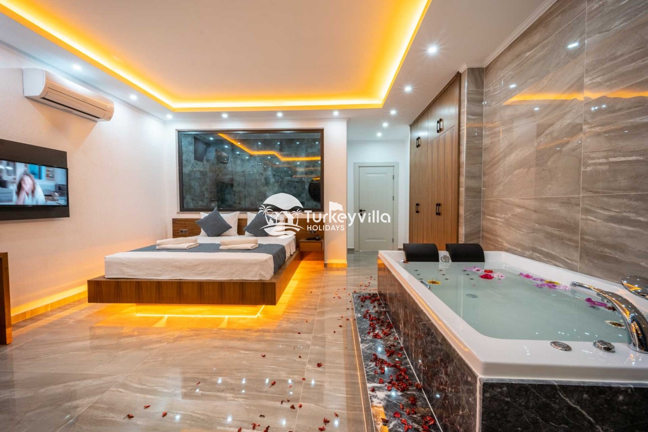 1.Bedroom: There is a double bed, wardrobe, bedside table, air conditioning, make-up table, jacuzzi and bathroom and toilet.