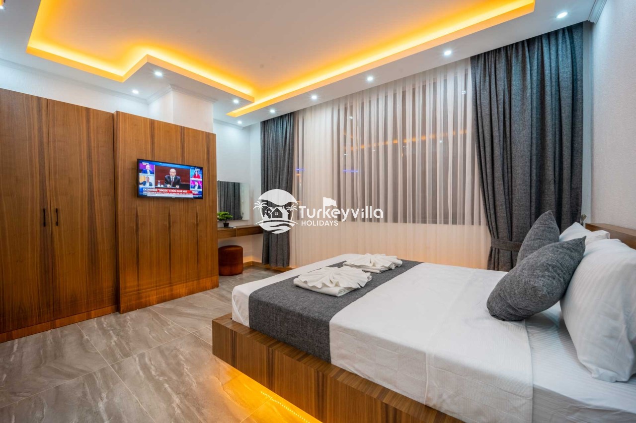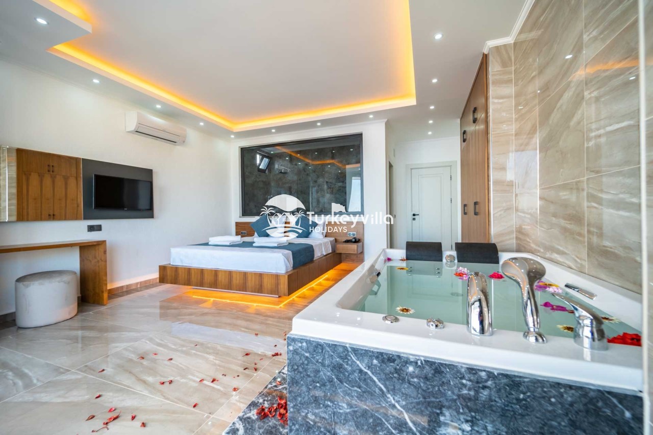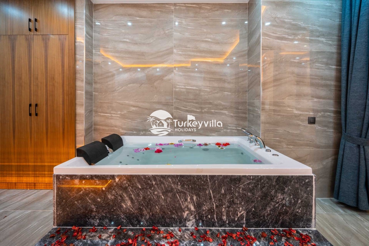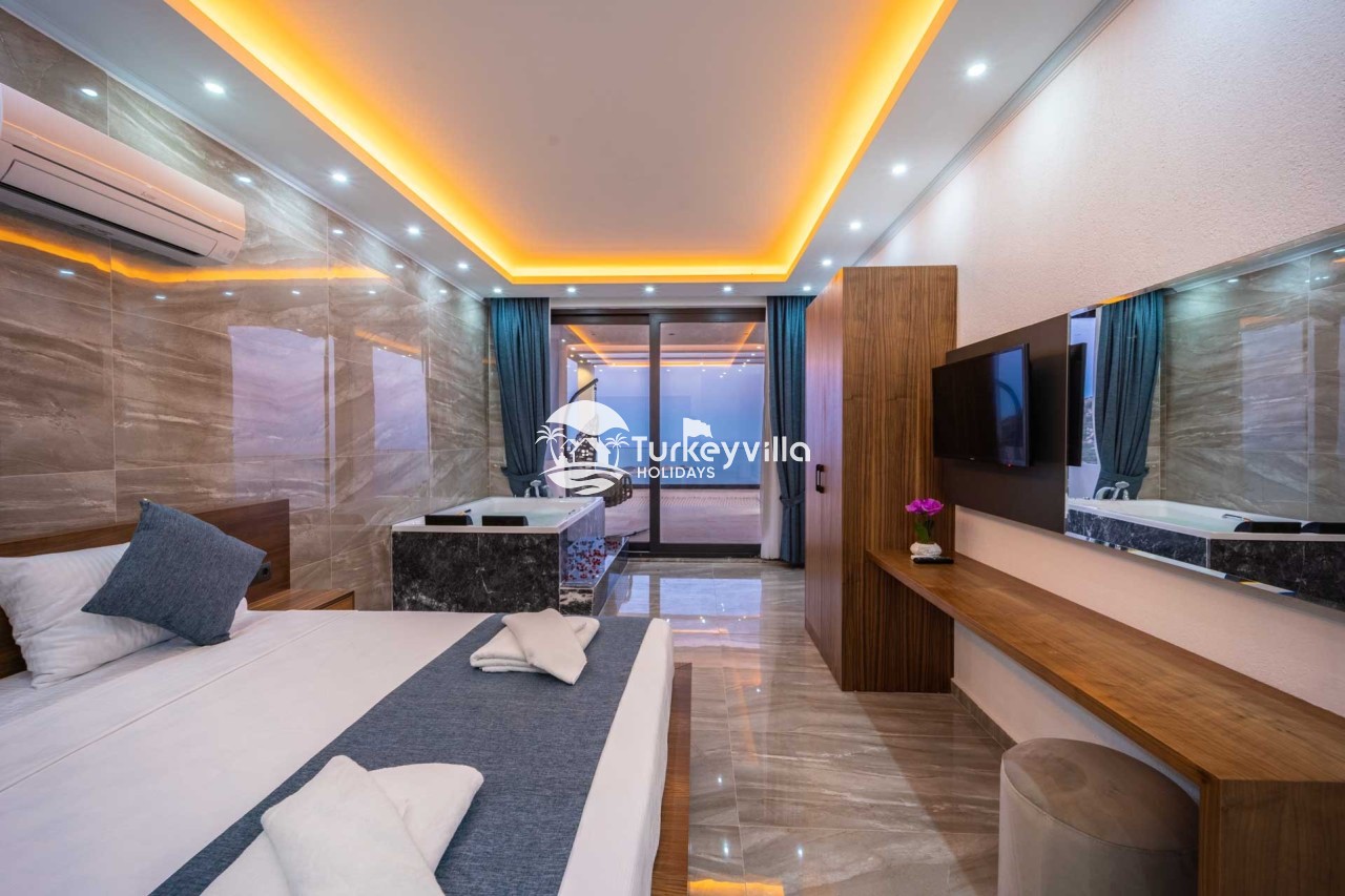 1.Bedroom: There is a double bed, wardrobe, bedside table, air conditioning, make-up table, jacuzzi and bathroom and toilet.