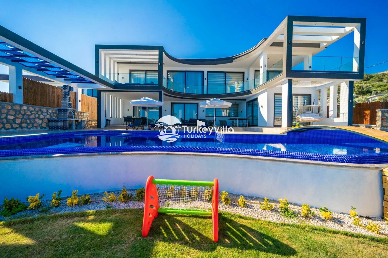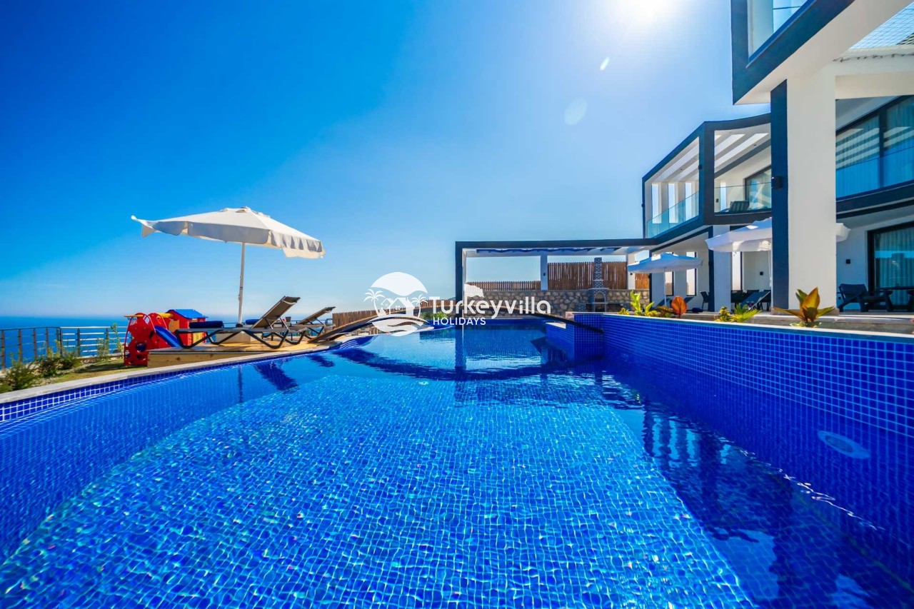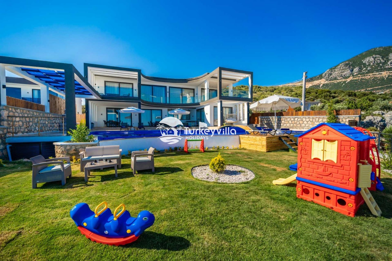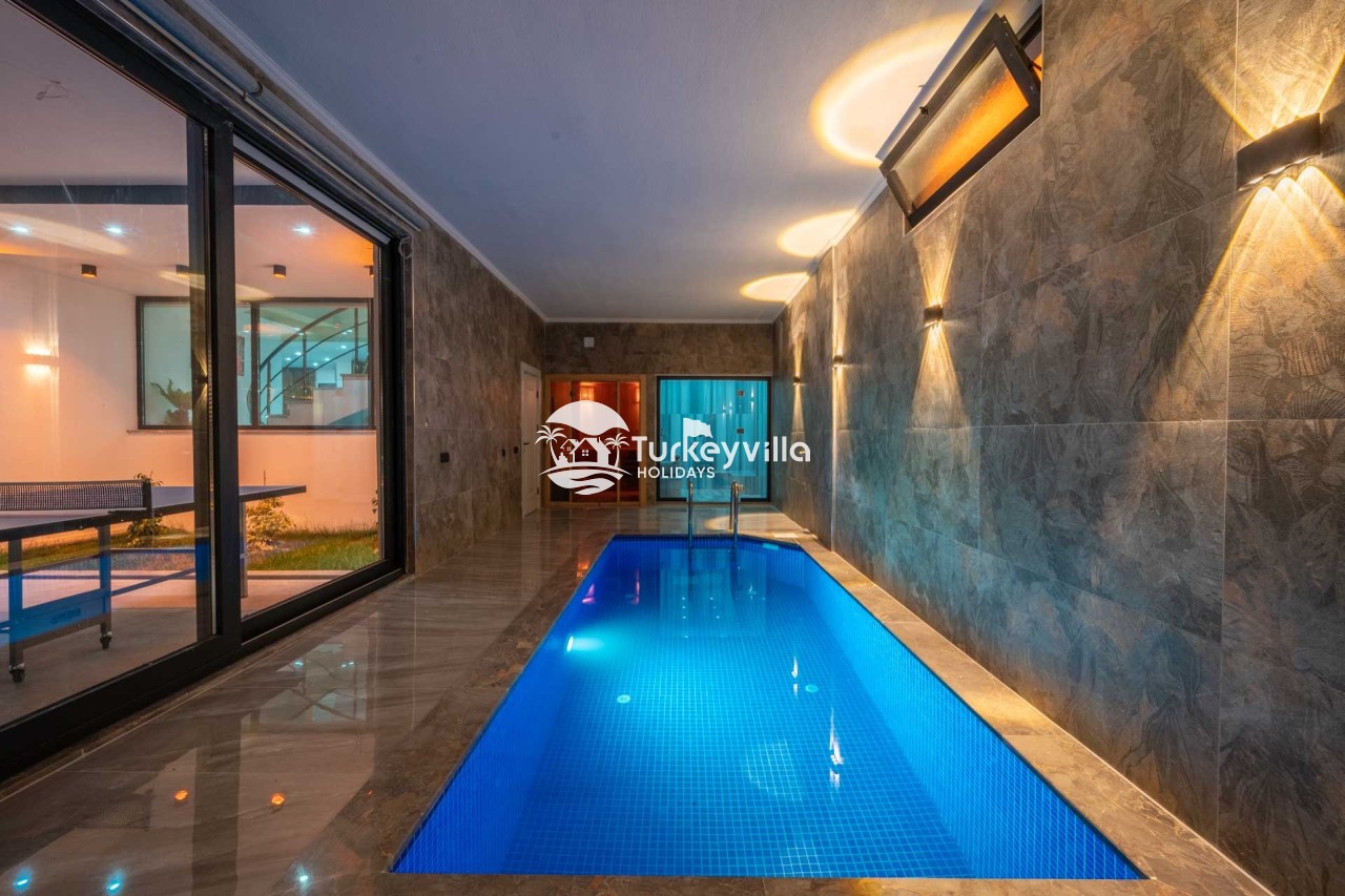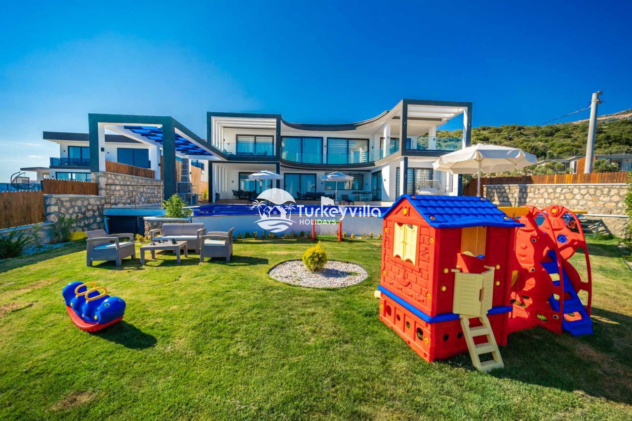 Villa Kenan Our ultra-luxury rental villa, built in 2023 in the Kalkan Ulugöl region, has 6 bedrooms and a capacity of 11 people. It is an ideal option for large families and groups of friends. Our villa, which has an uninterrupted sea view, offers you privileges within the villa. In addition to having a Sauna, Turkish Bath, Double Jacuzzi and Indoor Heating pool and a jacuzzi in the outdoor pool, the garden area where you can have pleasant moments, table tennis and table football, and the children’s playground have been carefully prepared for your children to enjoy their holiday. Villa Kenan, Kalkan villa, Kalkan rental villas, large family villas, villas with children’s pools, villas with jacuzzis, villas with sea views, villas with conservative pools, villas with heated pools, villas with private pools, villas with children’s playgrounds are among the options.