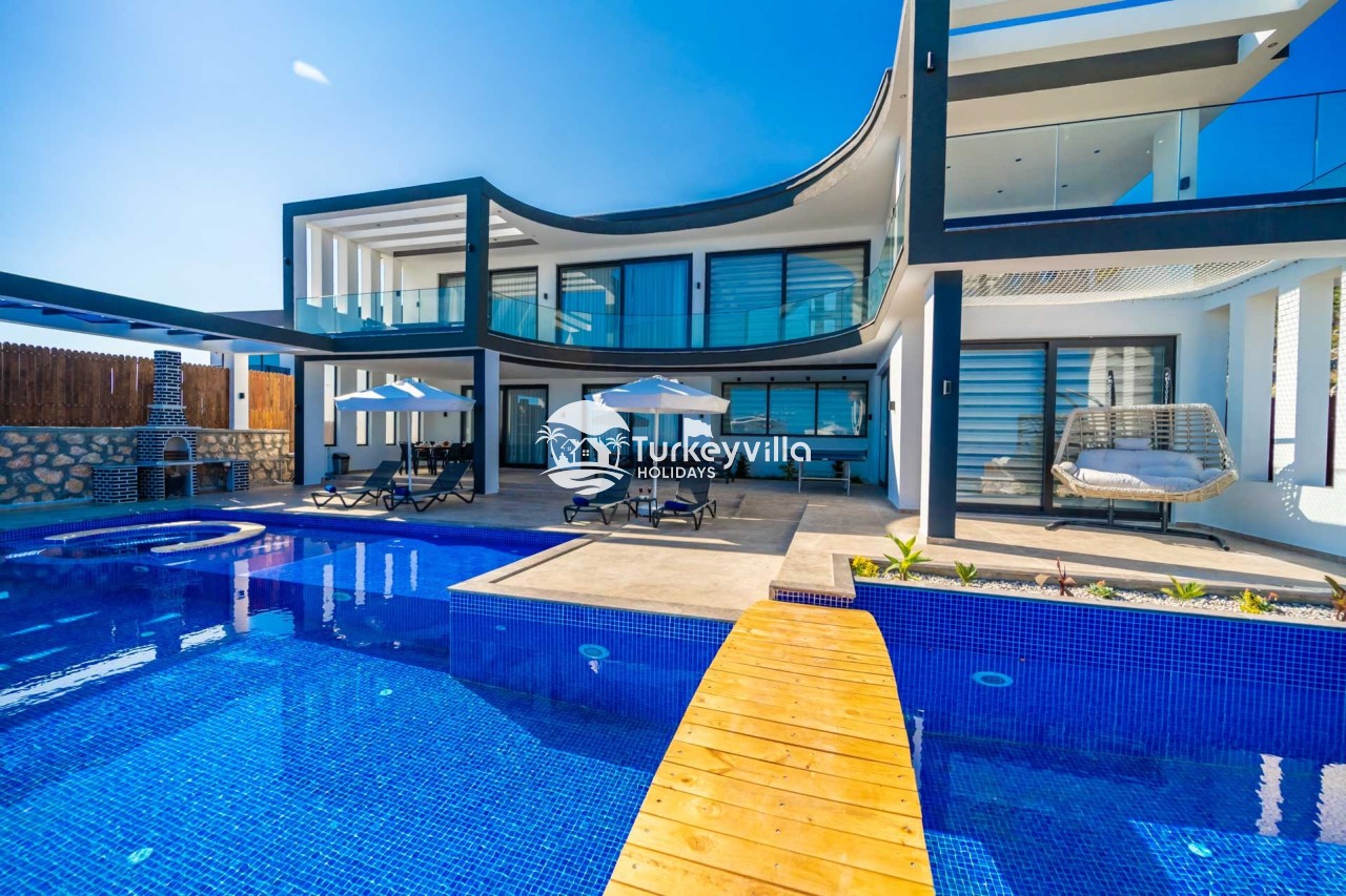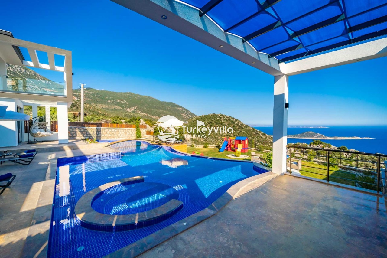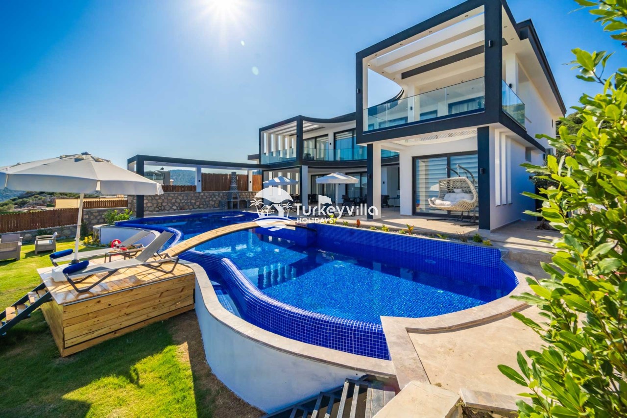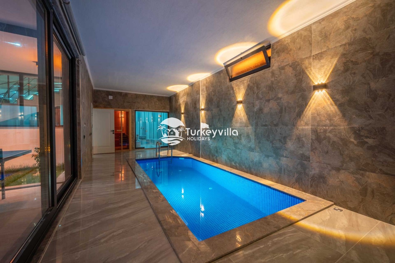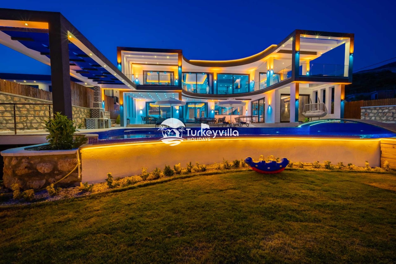 Villa Kenan Our ultra-luxury rental villa, built in 2023 in the Kalkan Ulugöl region, has 6 bedrooms and a capacity of 11 people. It is an ideal option for large families and groups of friends. Our villa, which has an uninterrupted sea view, offers you privileges within the villa. In addition to having a Sauna, Turkish Bath, Double Jacuzzi and Indoor Heating pool and a jacuzzi in the outdoor pool, the garden area where you can have pleasant moments, table tennis and table football, and the children’s playground have been carefully prepared for your children to enjoy their holiday. Villa Kenan, Kalkan villa, Kalkan rental villas, large family villas, villas with children’s pools, villas with jacuzzis, villas with sea views, villas with conservative pools, villas with heated pools, villas with private pools, villas with children’s playgrounds are among the options.