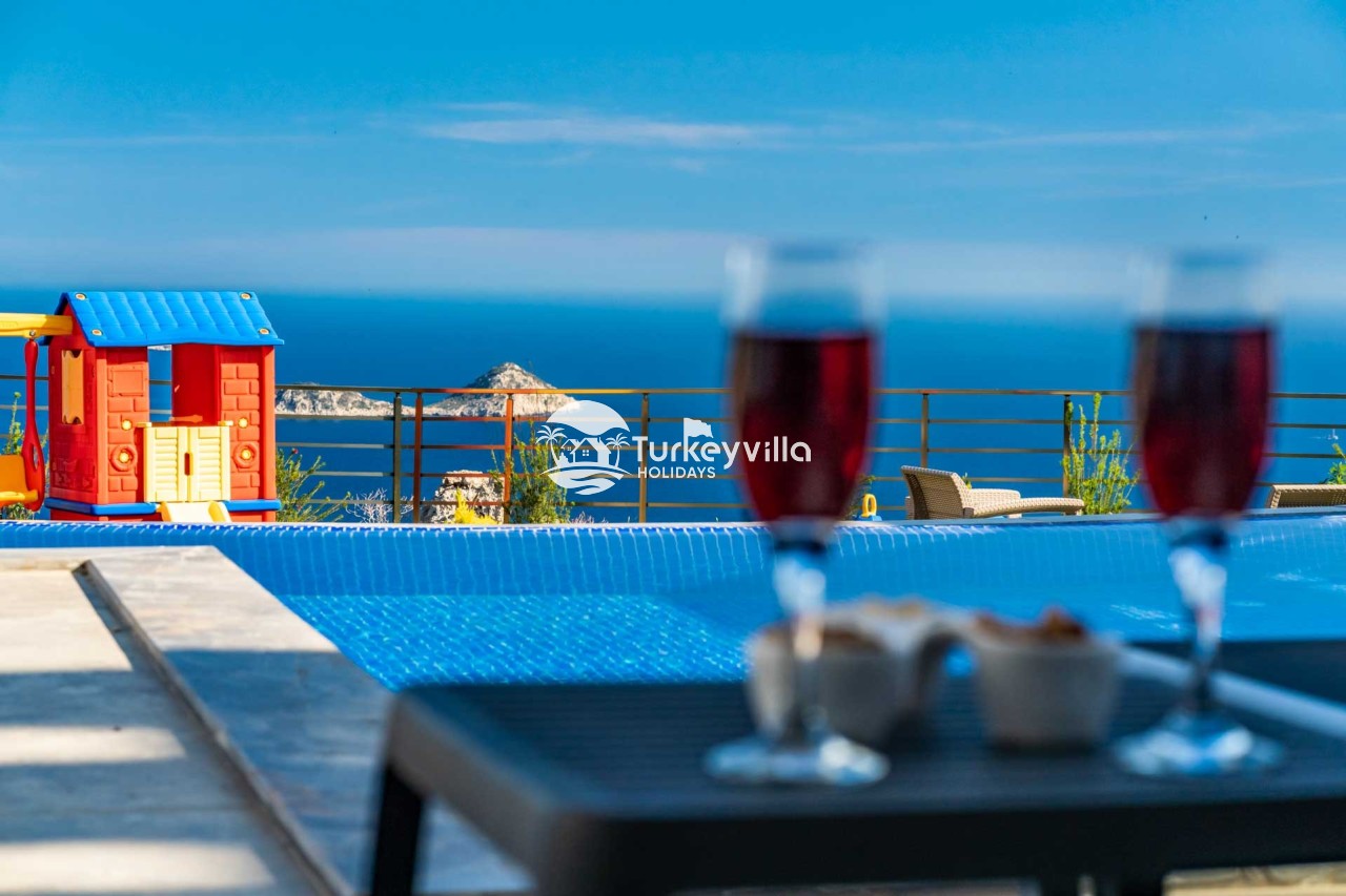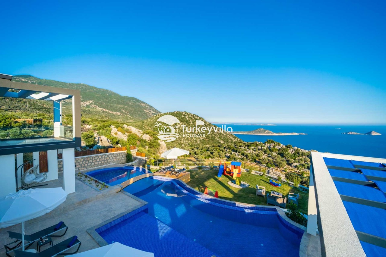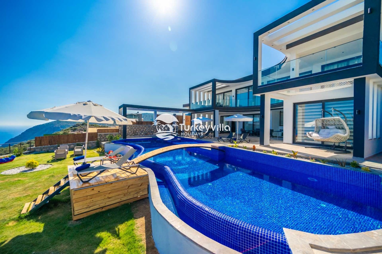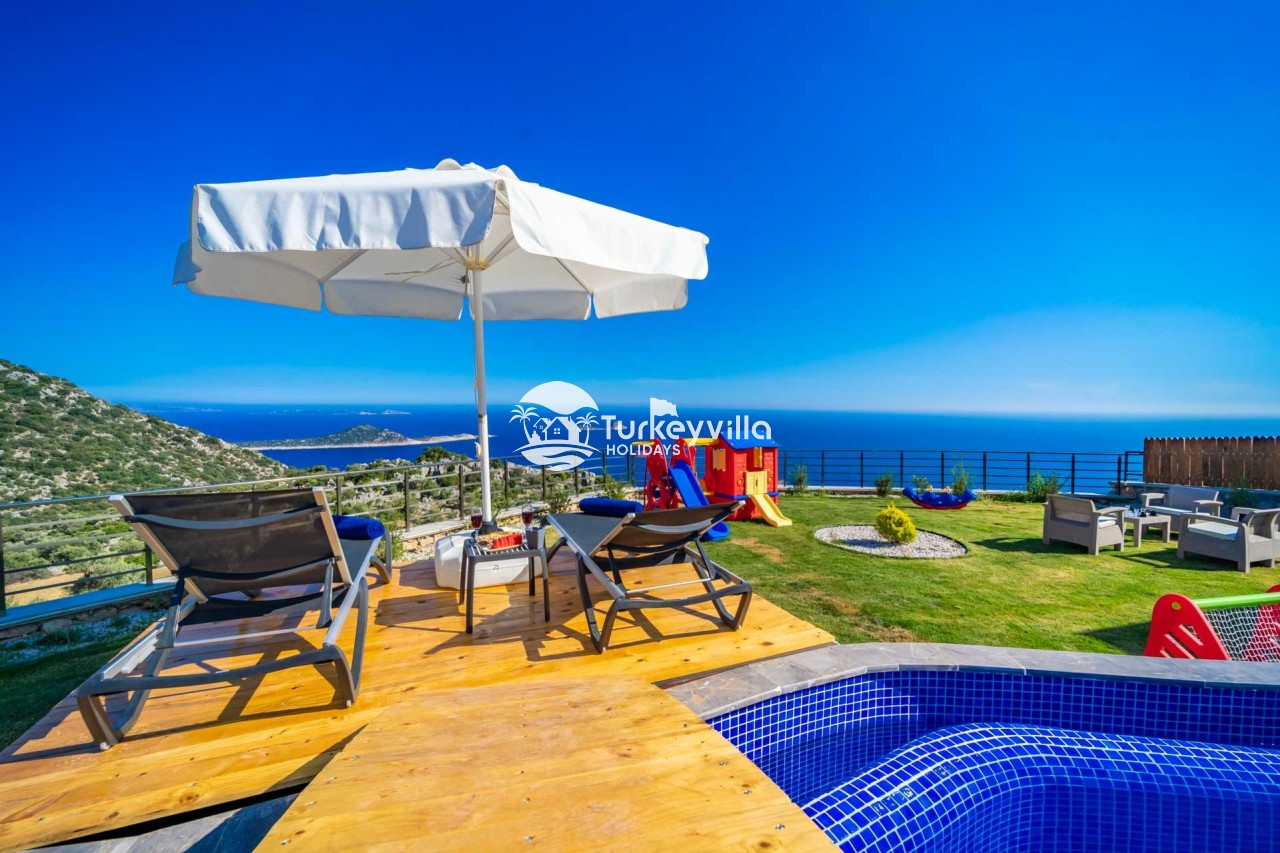 Villa Kenan Our ultra-luxury rental villa, built in 2023 in the Kalkan Ulugöl region, has 6 bedrooms and a capacity of 11 people. It is an ideal option for large families and groups of friends. Our villa, which has an uninterrupted sea view, offers you privileges within the villa. In addition to having a Sauna, Turkish Bath, Double Jacuzzi and Indoor Heating pool and a jacuzzi in the outdoor pool, the garden area where you can have pleasant moments, table tennis and table football, and the children’s playground have been carefully prepared for your children to enjoy their holiday. Villa Kenan, Kalkan villa, Kalkan rental villas, large family villas, villas with children’s pools, villas with jacuzzis, villas with sea views, villas with conservative pools, villas with heated pools, villas with private pools, villas with children’s playgrounds are among the options.