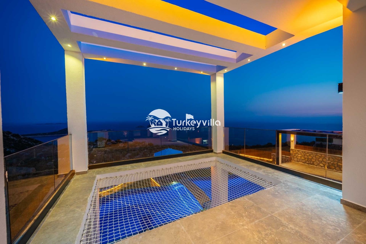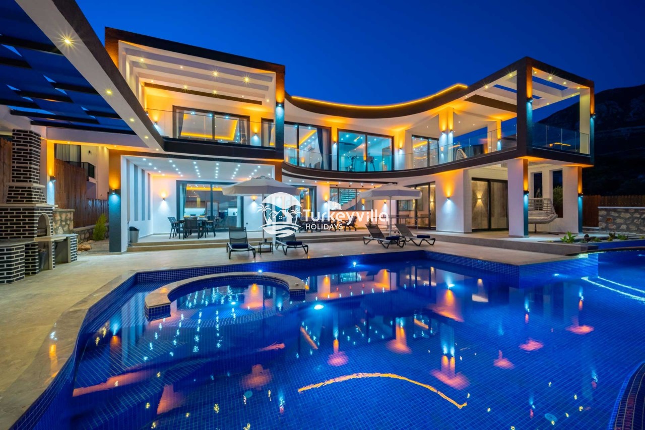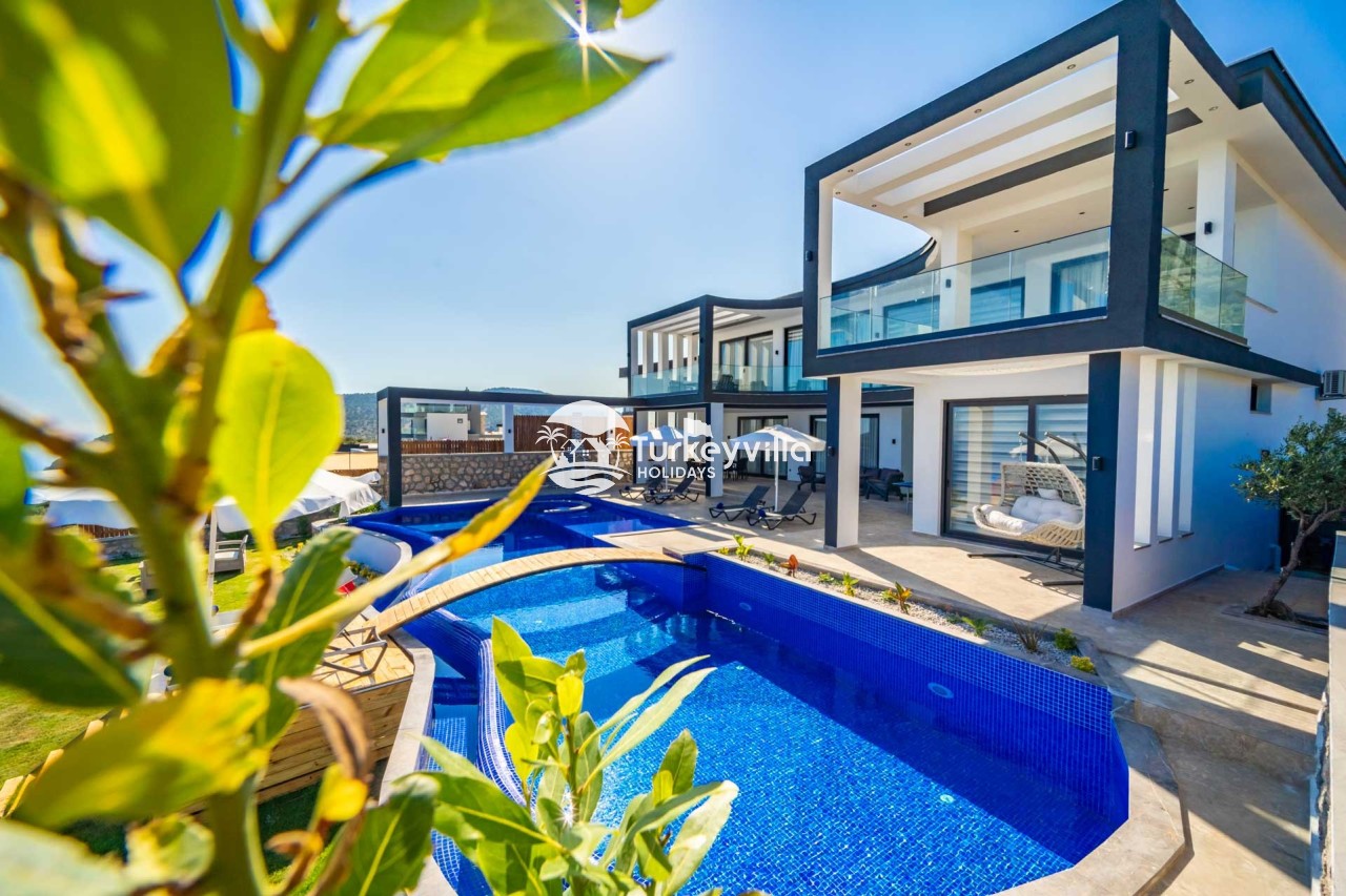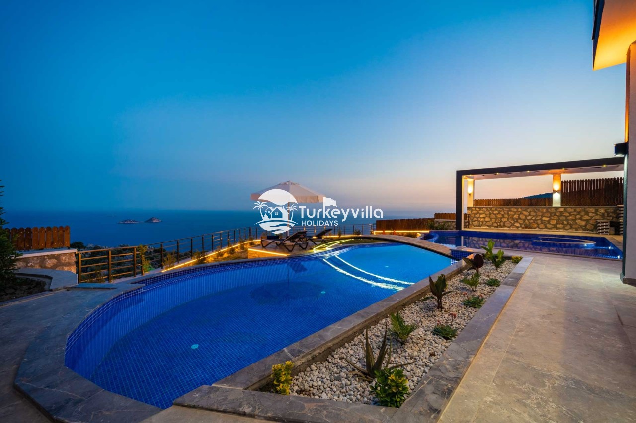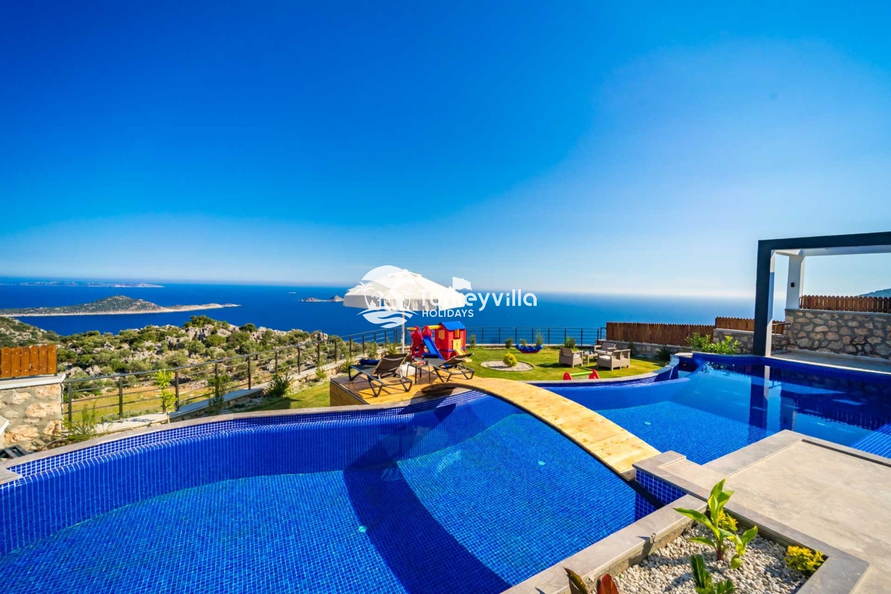 Villa Kenan Our ultra-luxury rental villa, built in 2023 in the Kalkan Ulugöl region, has 6 bedrooms and a capacity of 11 people. It is an ideal option for large families and groups of friends. Our villa, which has an uninterrupted sea view, offers you privileges within the villa. In addition to having a Sauna, Turkish Bath, Double Jacuzzi and Indoor Heating pool and a jacuzzi in the outdoor pool, the garden area where you can have pleasant moments, table tennis and table football, and the children’s playground have been carefully prepared for your children to enjoy their holiday. Villa Kenan, Kalkan villa, Kalkan rental villas, large family villas, villas with children’s pools, villas with jacuzzis, villas with sea views, villas with conservative pools, villas with heated pools, villas with private pools, villas with children’s playgrounds are among the options.