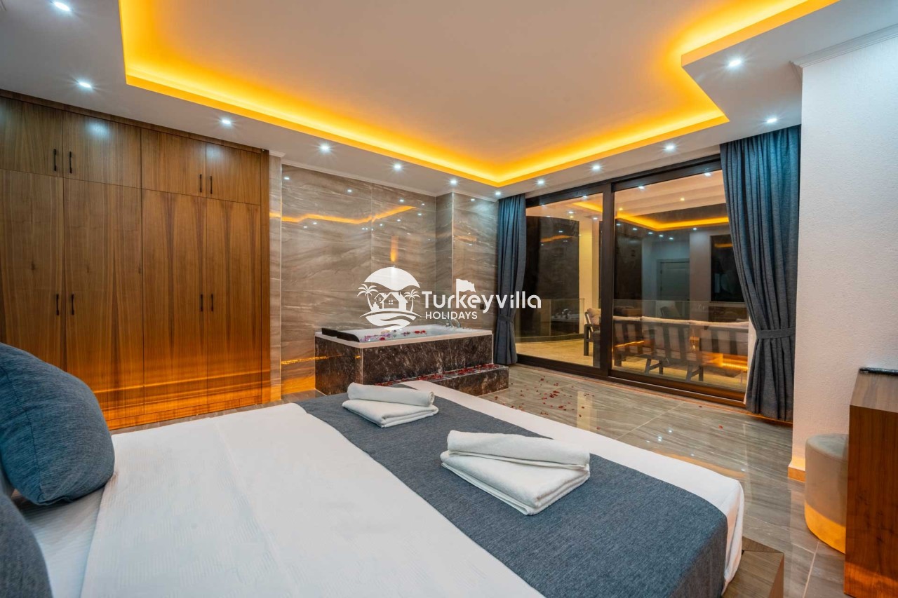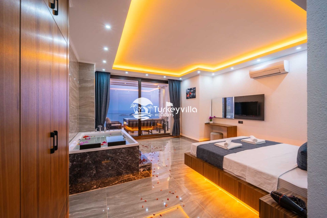 2.Bedroom: There is a double bed, wardrobe, bedside table, air conditioning, make-up table, jacuzzi and bathroom and toilet.