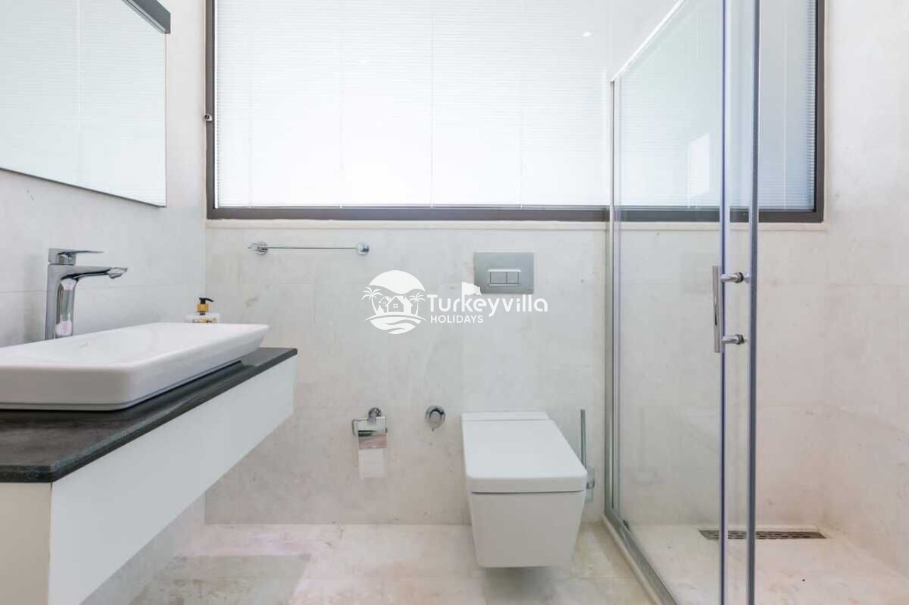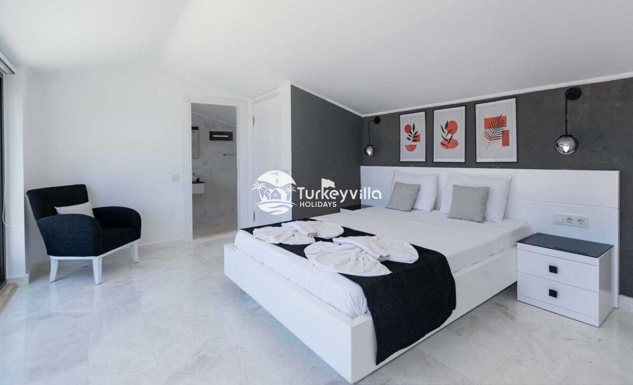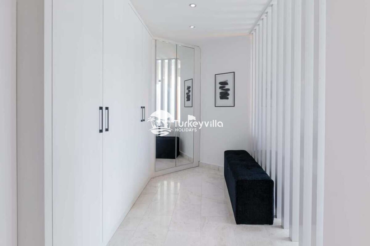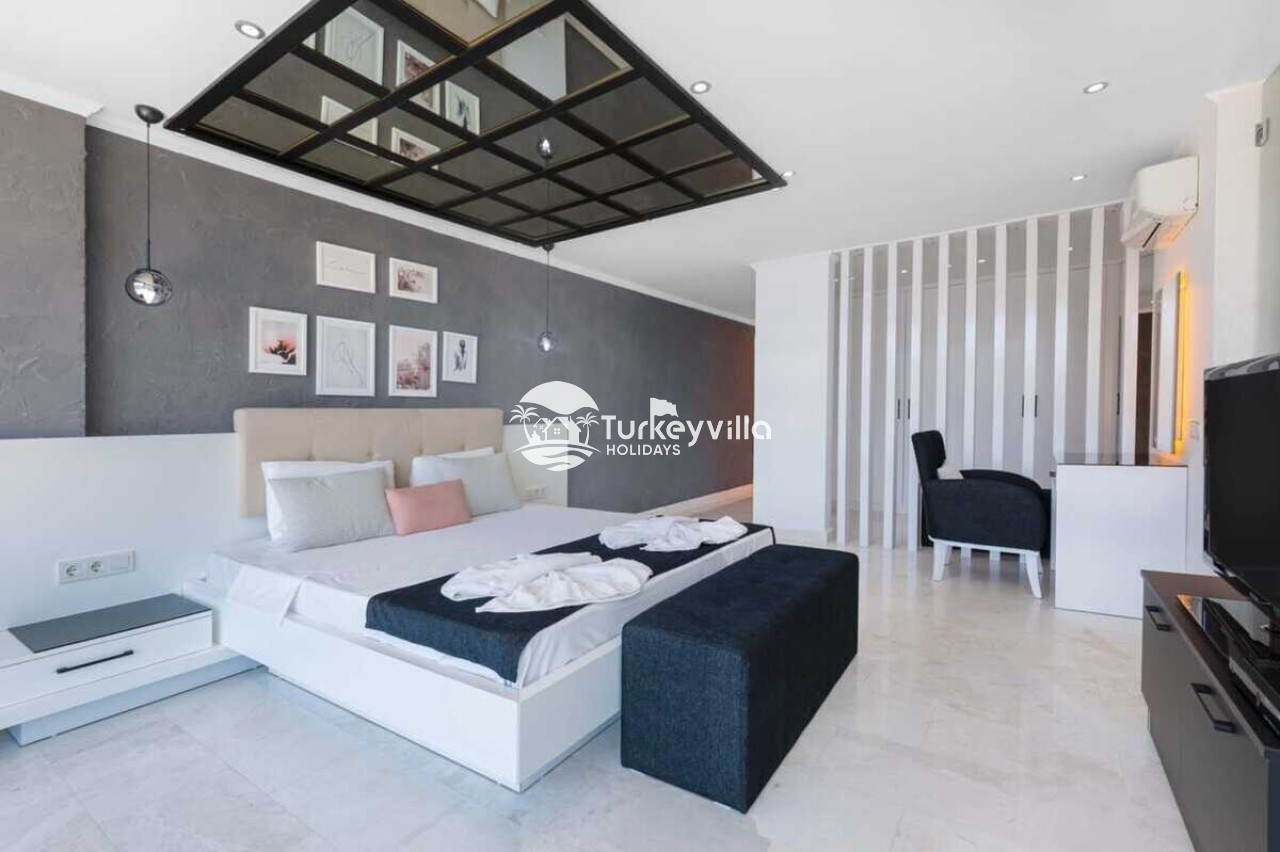 Saloon : This hall, where you can comfortably watch the sea view, is designed with modern and luxurious details. In the living room, there is a luxury sitting group, plasma TV, satellite receiver, dining table, air conditioning, iron and ironing board. There is an exit to the pool from the living room.