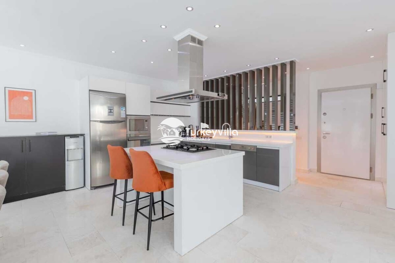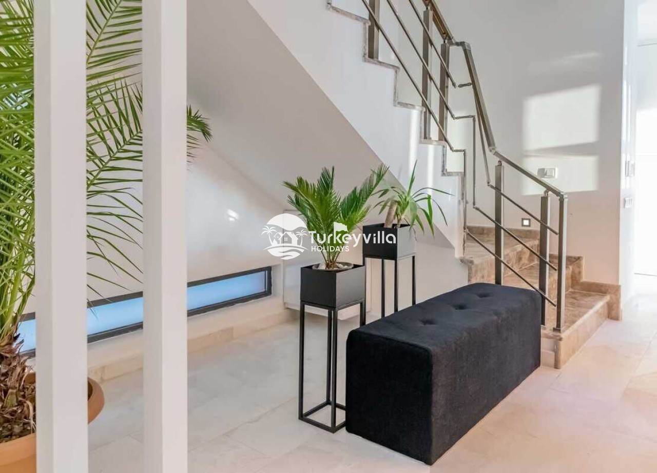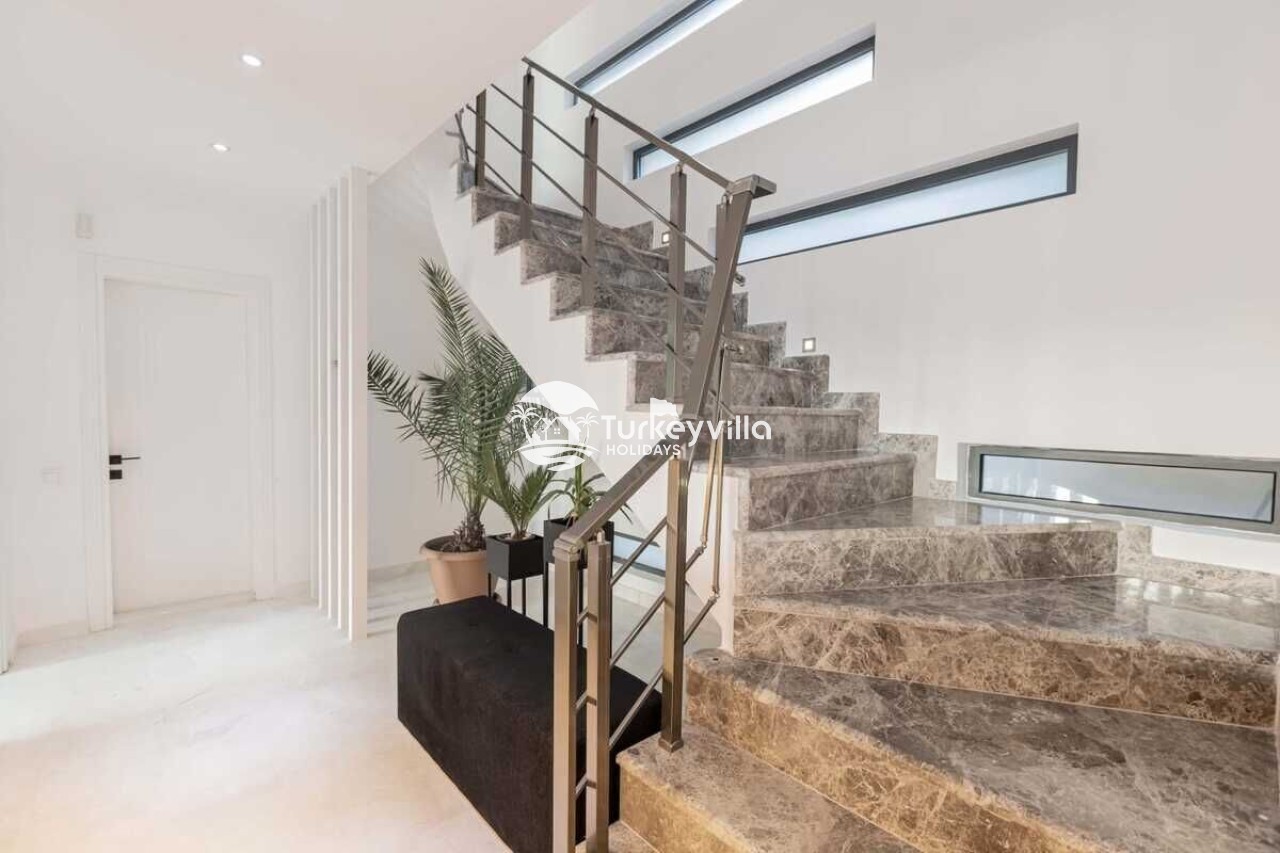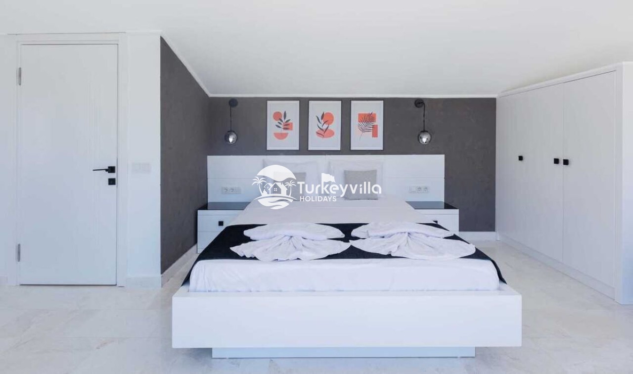 Saloon : This hall, where you can comfortably watch the sea view, is designed with modern and luxurious details. In the living room, there is a luxury sitting group, plasma TV, satellite receiver, dining table, air conditioning, iron and ironing board. There is an exit to the pool from the living room.
