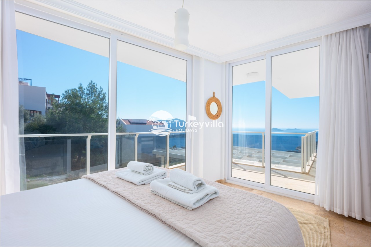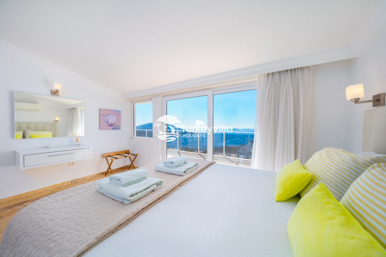 2nd Bedroom: One double bed, wardrobe, dresser, make-up table, air conditioning and bathroom. It has a balcony with sea and Kalkan views.