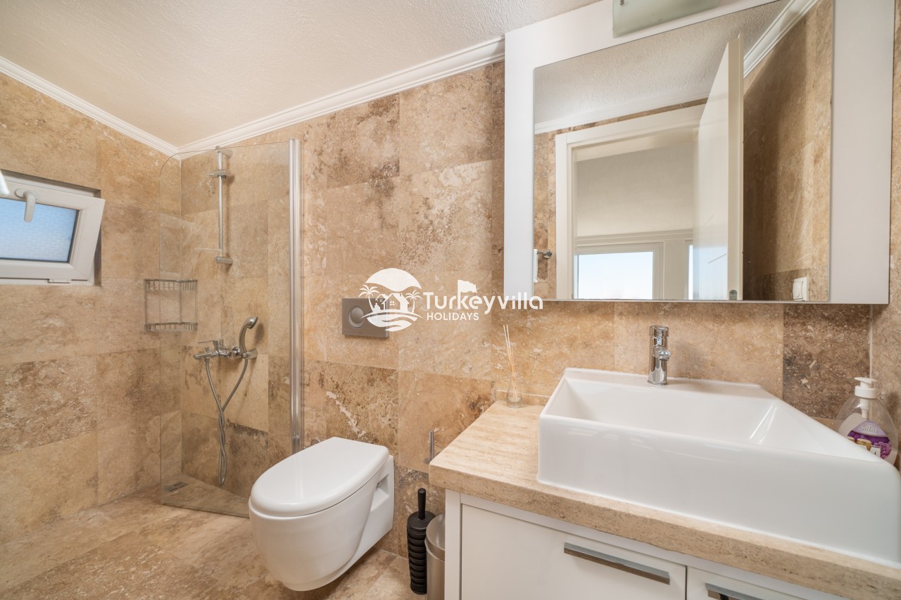 1st Bedroom: One double bed, wardrobe, dresser, make-up table, air conditioning and bathroom. The room also has a balcony with sea and Kalkan views.